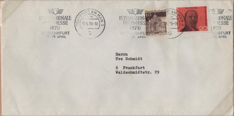 using a 10pf definitive (Scott #937) for the unsealed printed matter rate; someone accidentally sealed them, making this a postal fraud situation with the stamps & covers being confiscated when found; local Frankfurt am Main cover w/ pictorial