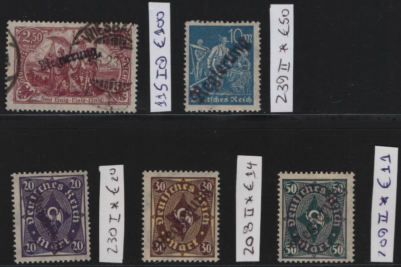 Selection (5) "Regierung" Wiesbaden Official control overprints on regular issues: Type I ovpt 2.50m w/ Wiesbden cds and 20m Posthorn unused HR; Type II ovpt 10m Farmers, 30m & 50m Posthorns, all unused HR; Michel Nos 115 I, 239 II, 230 I, 208 II and