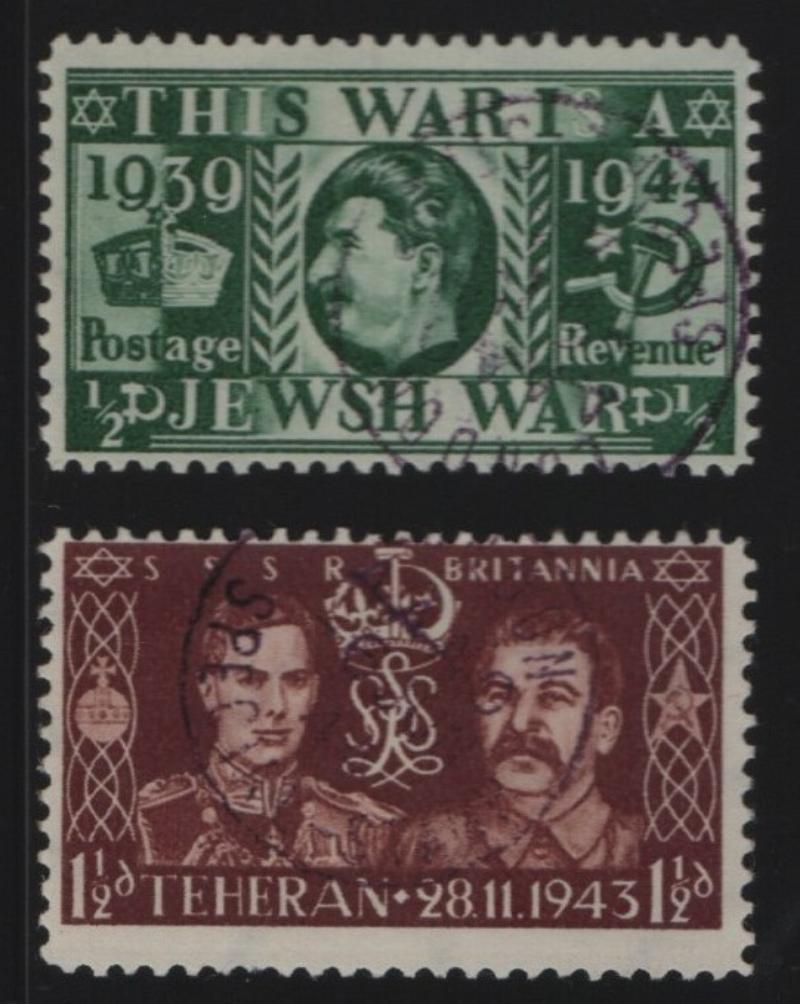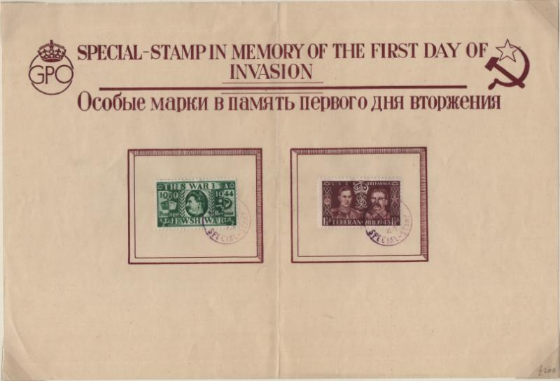 German Propaganda stamps mimicking the KGVI Coronation issue, with the king & Stalin, affixed & canceled to souvenir page in English & Russian, VF (Michel 2PG)