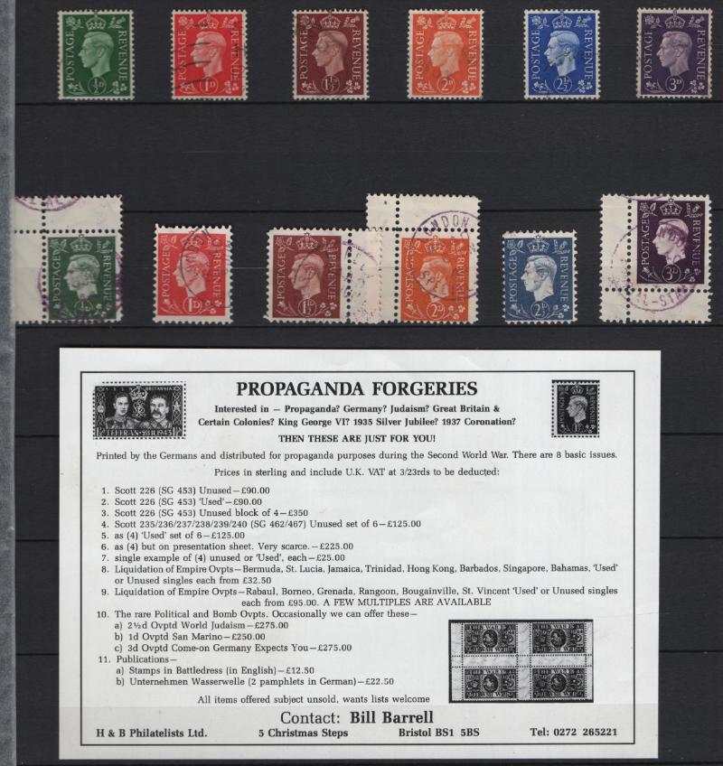 German Propaganda Forgeries of current KGVI definitives, w/ Star of David atop crown, complete set of (6) w/ purple cancels, some w/ selvage, abt (800) sets produced, F-VF (Michel 3-8) (Image)