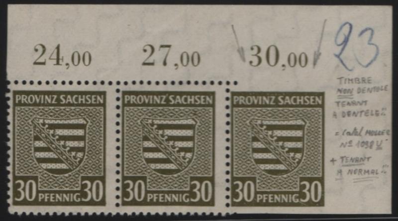 13N11 Saxony Arms 30pf olive green, UR corner strip/3, right stamp imperf three sides; notations in selvage, error stamp NH VF (Michel 83Xa Udr) (Image)