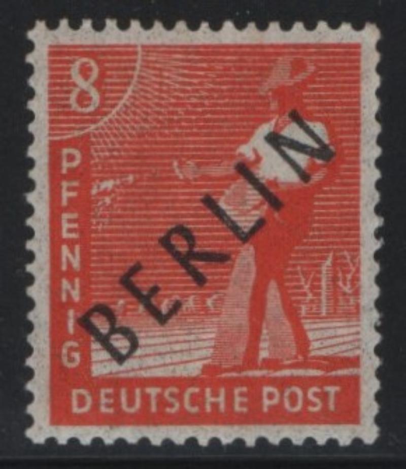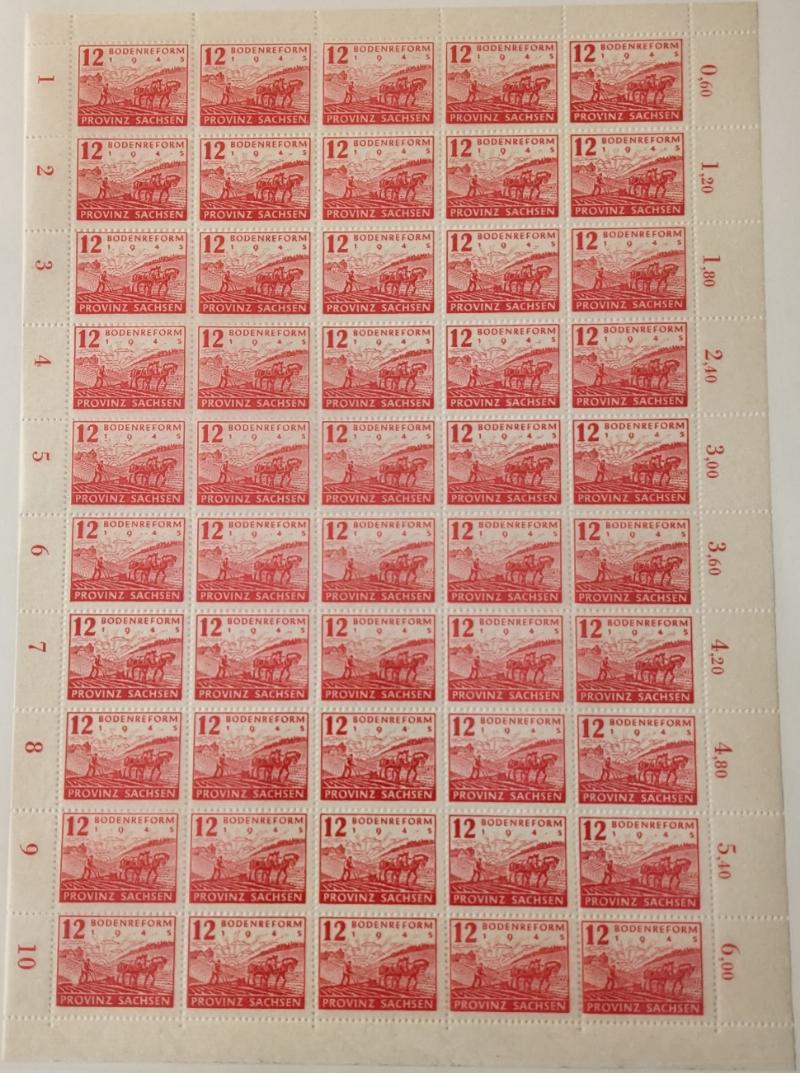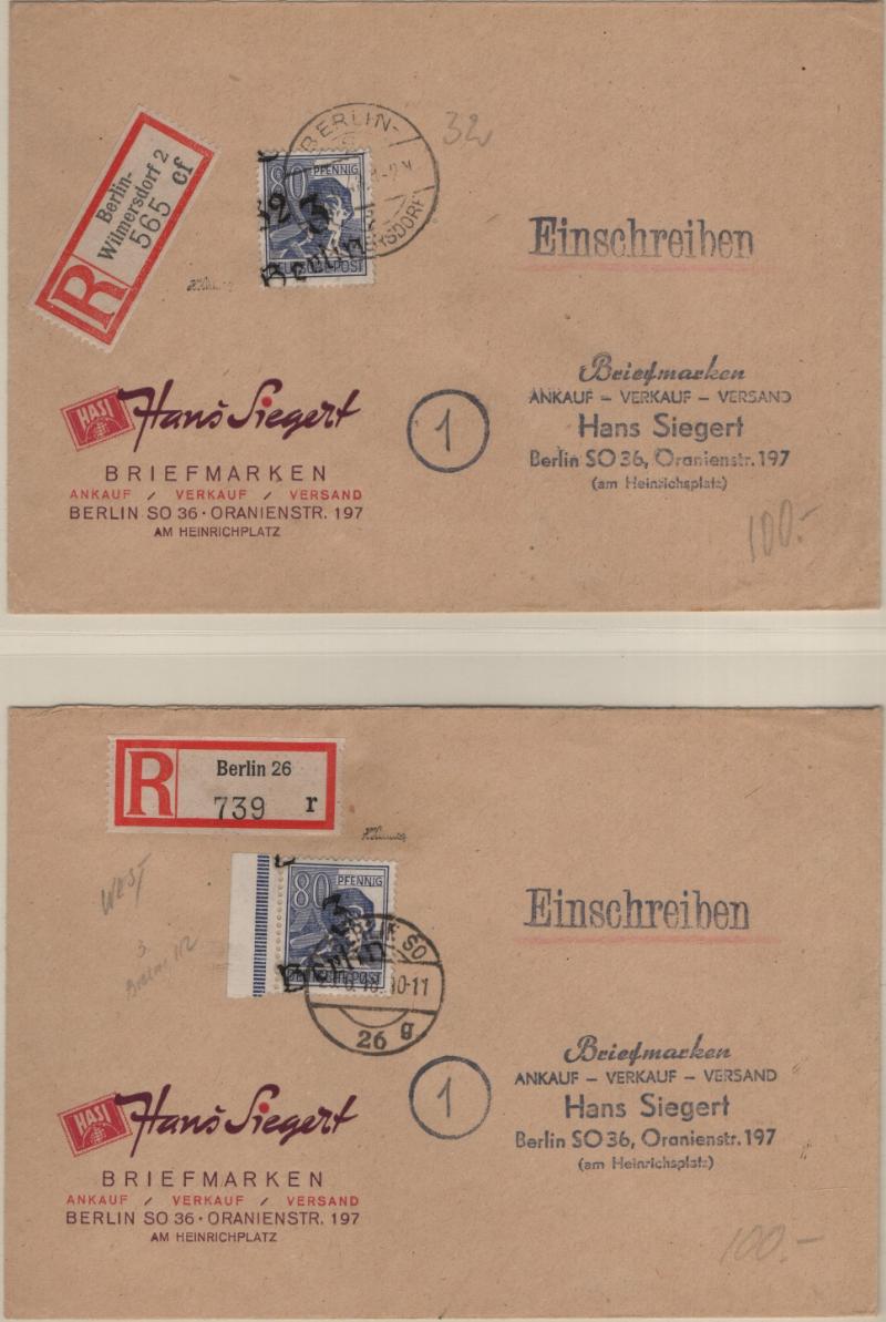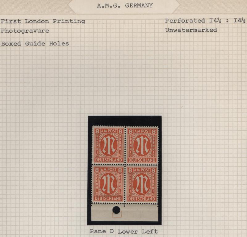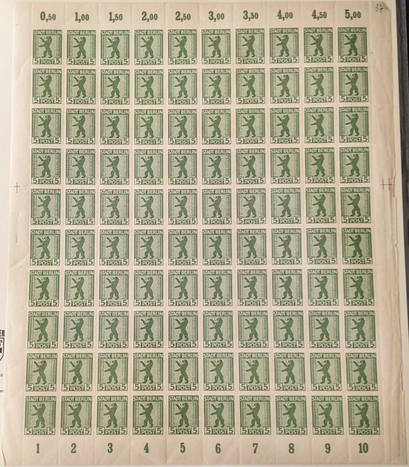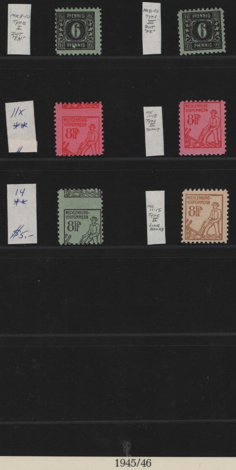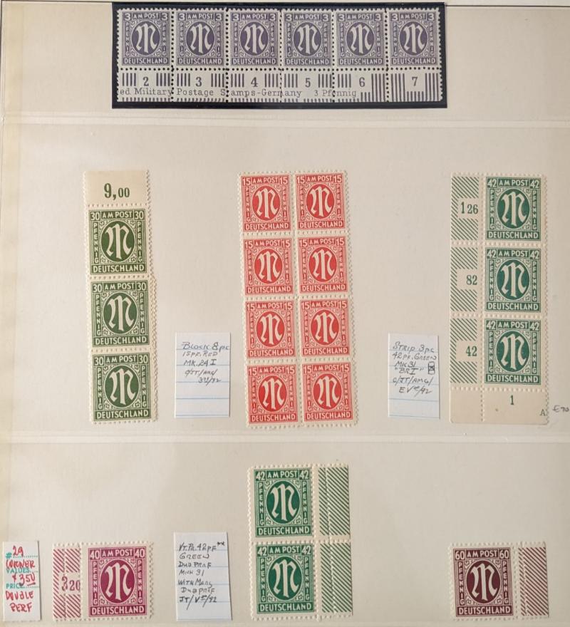 (15) singles or pairs w/ shifted or doubled perforation EFOs; couple fly-specking flaws and 84pf margin single w/ "82" instead of "84" error in selvage counter (Michel 34 Br I); block of 15pf w/ one stamp having "1" instead of "I" in "pfennig" (24
