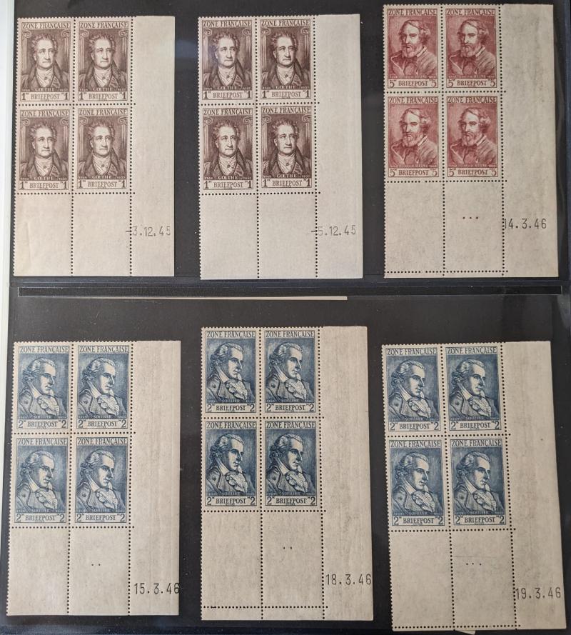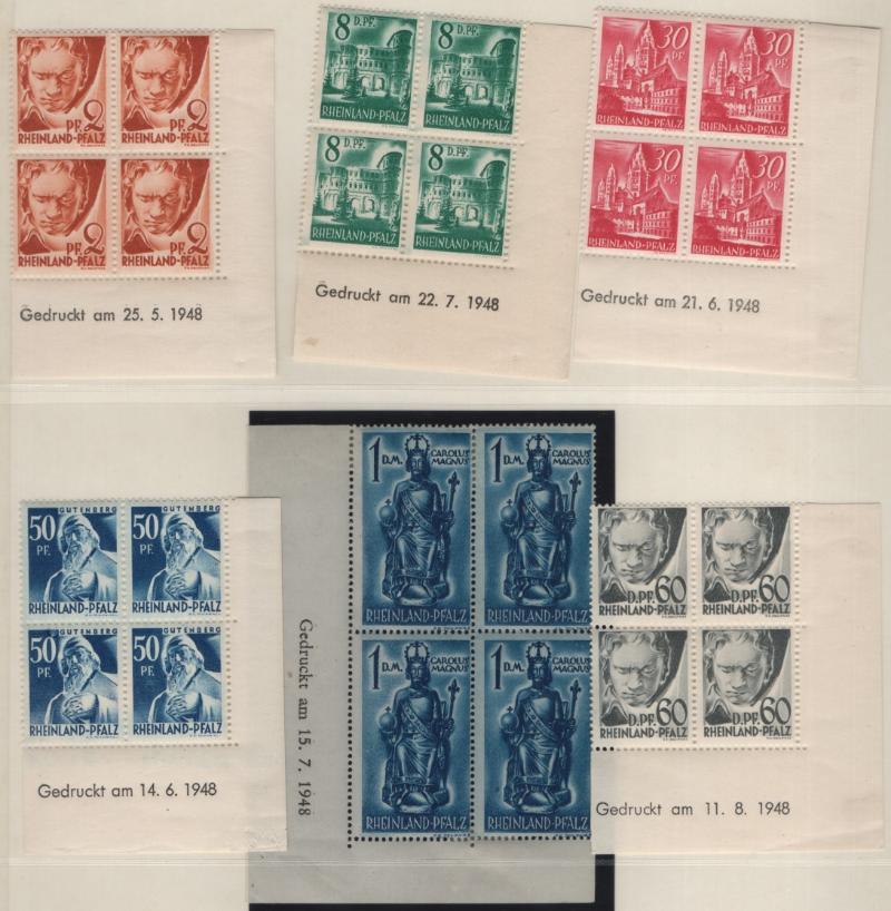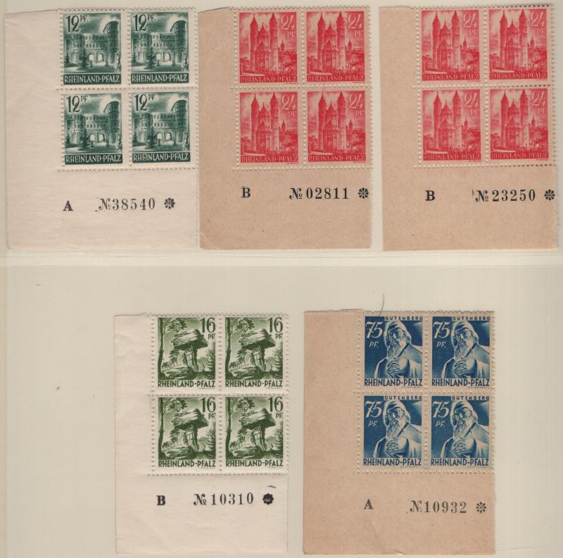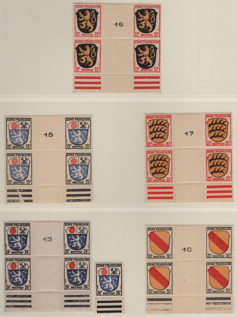 corner blocks w/ plate or sheet numbers, cutting lines, etc; comprehensive but some block positions lacking (Michel 10-15 & vars); gen VF NH (Image) (imageb)