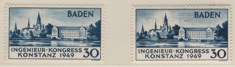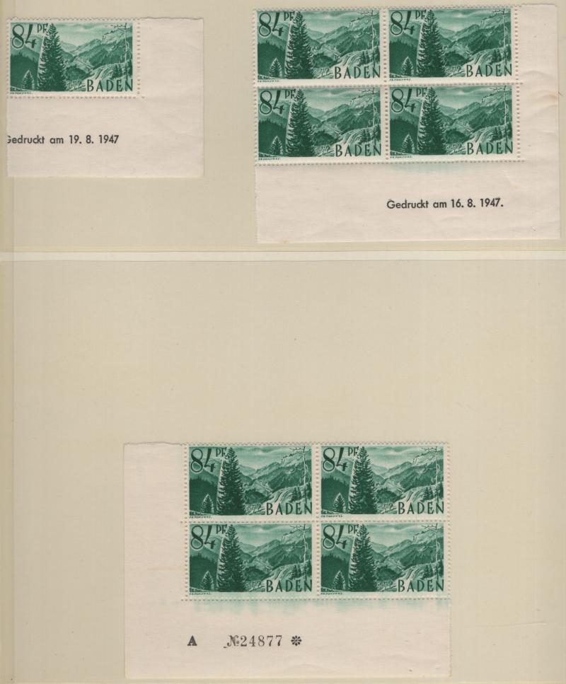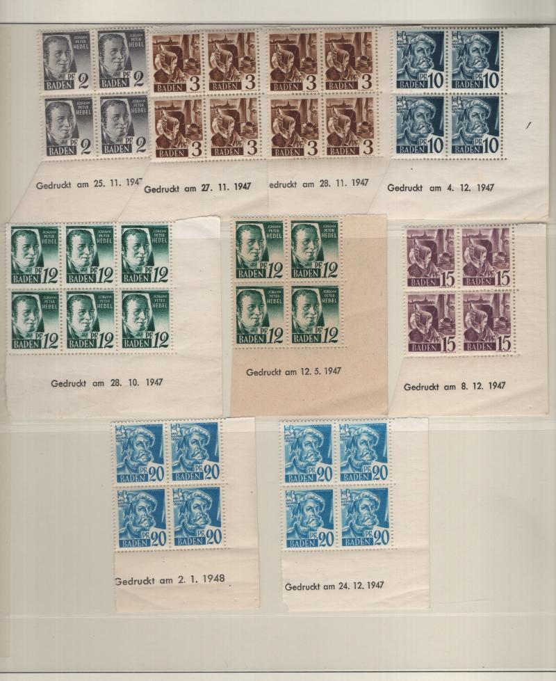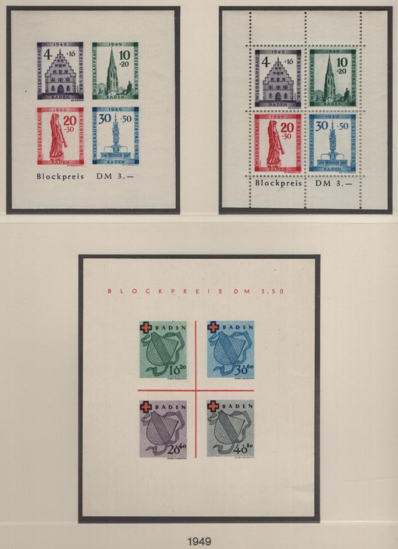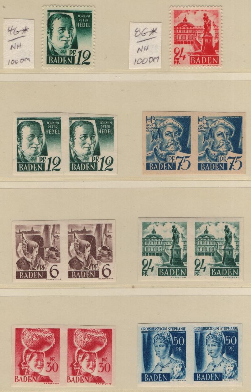 FRENCH ZONE - BADEN Unused collection in Lindner T album, basic stamps complete NH, not checked for Michel listed types, does incl both types Engineering Congress (5N41a) and S/S 5NB4a, 8a, 8b; extras incl 5N4 & 5N8 printed on gum side (€110); (6)