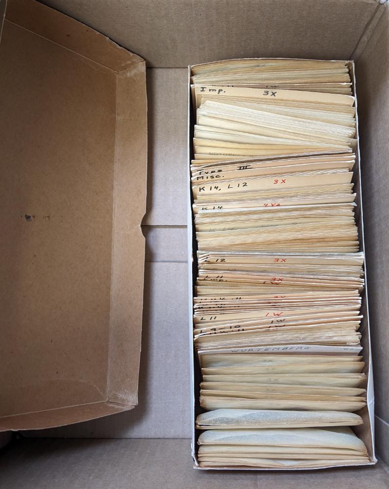 Shoe box packed w/ likely couple (1000) used Notopfer stamps in glassines, some marked w/ Michel specialized numbers, others not checked, mostly Allied Zone blue (Scott RA1-6) but also several glassines w/ blue or yellow French Zone Württemberg