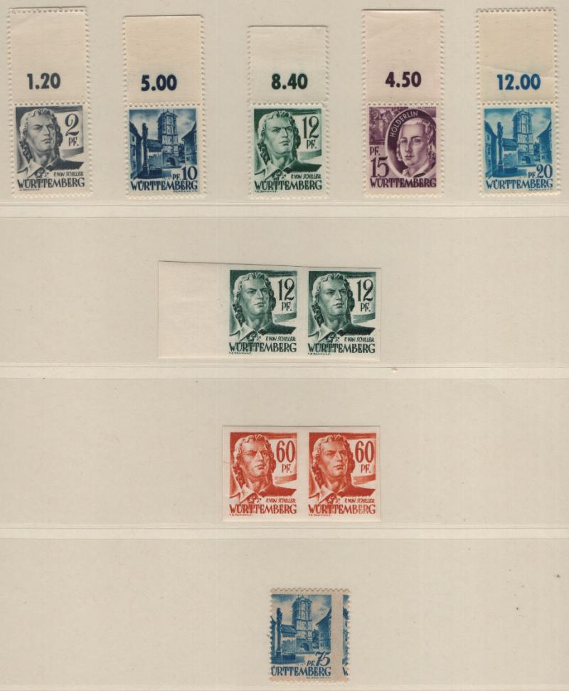 FRENCH ZONE - WÜRTTEMBERG unused collection in Lindner T album; complete NH, definitives not checked for Michel-listed types, S/S 8NB4a NGAI hinged; extras incl printed on gum side (6 diff), imperf pairs (4 diff), misperfs, print date blocks, 1st