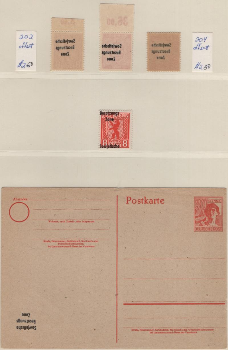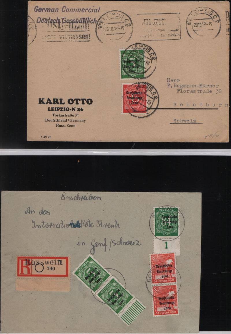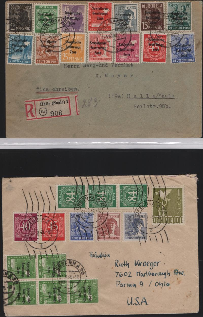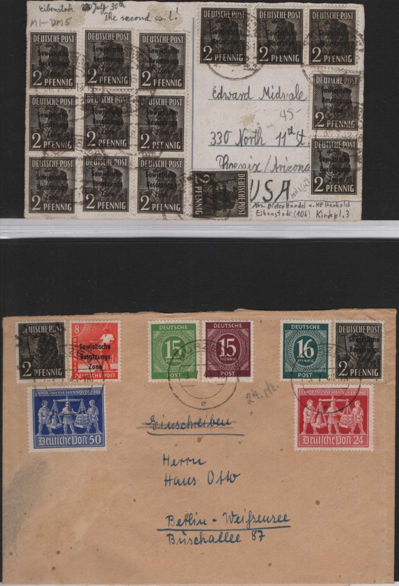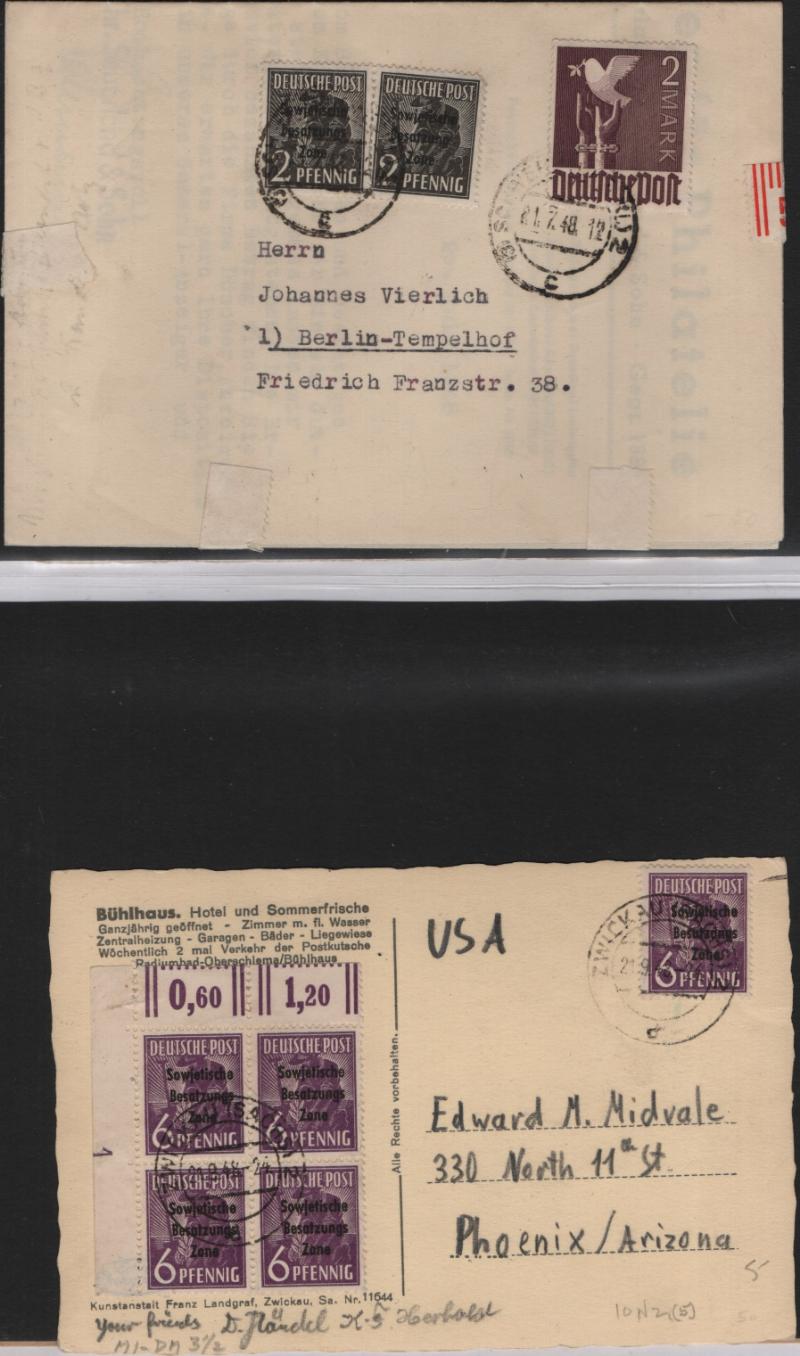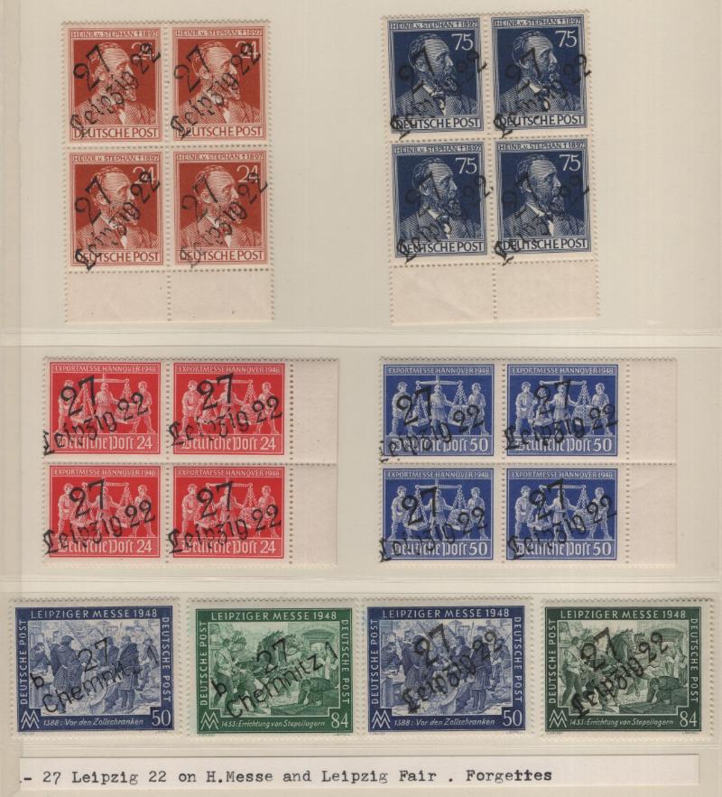 overprints incl mixed frankings, 30pf postal card w/ misplaced ovpt (P32); Famous People issue w/ couple mis-perfs, couple Leipzig Fair cards, Goethe S/S NH, several other covers; (Image) (imageb)