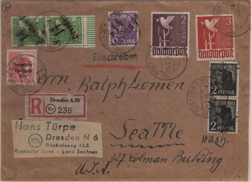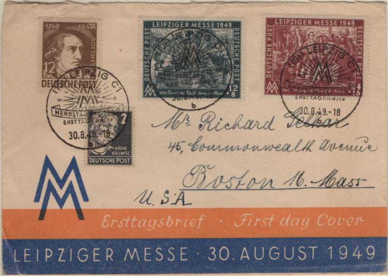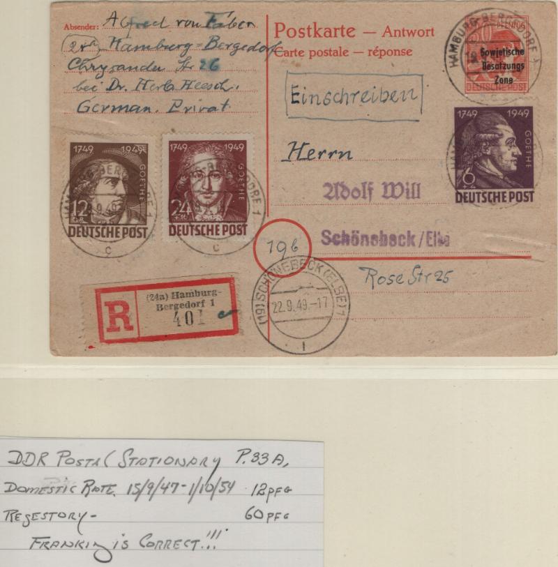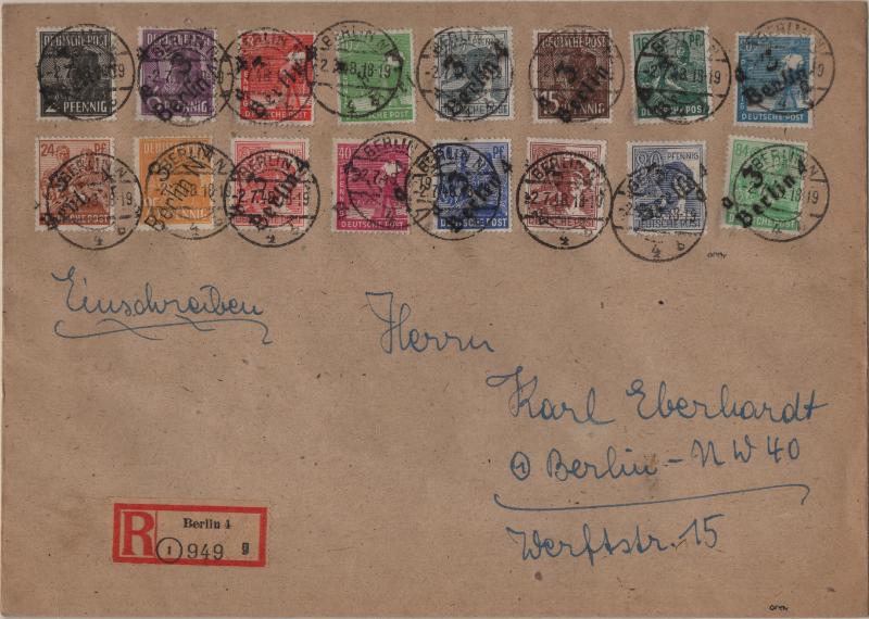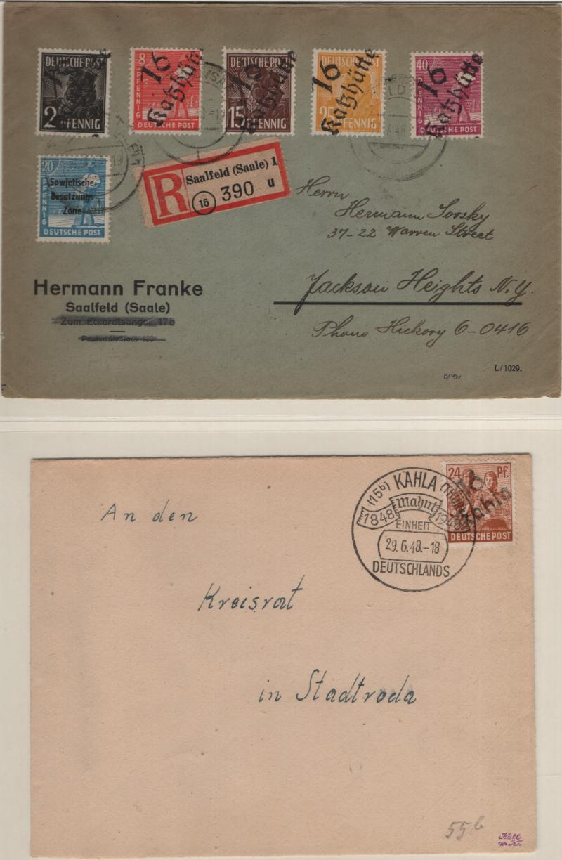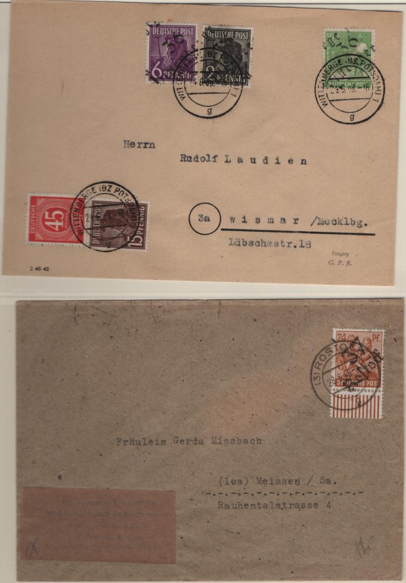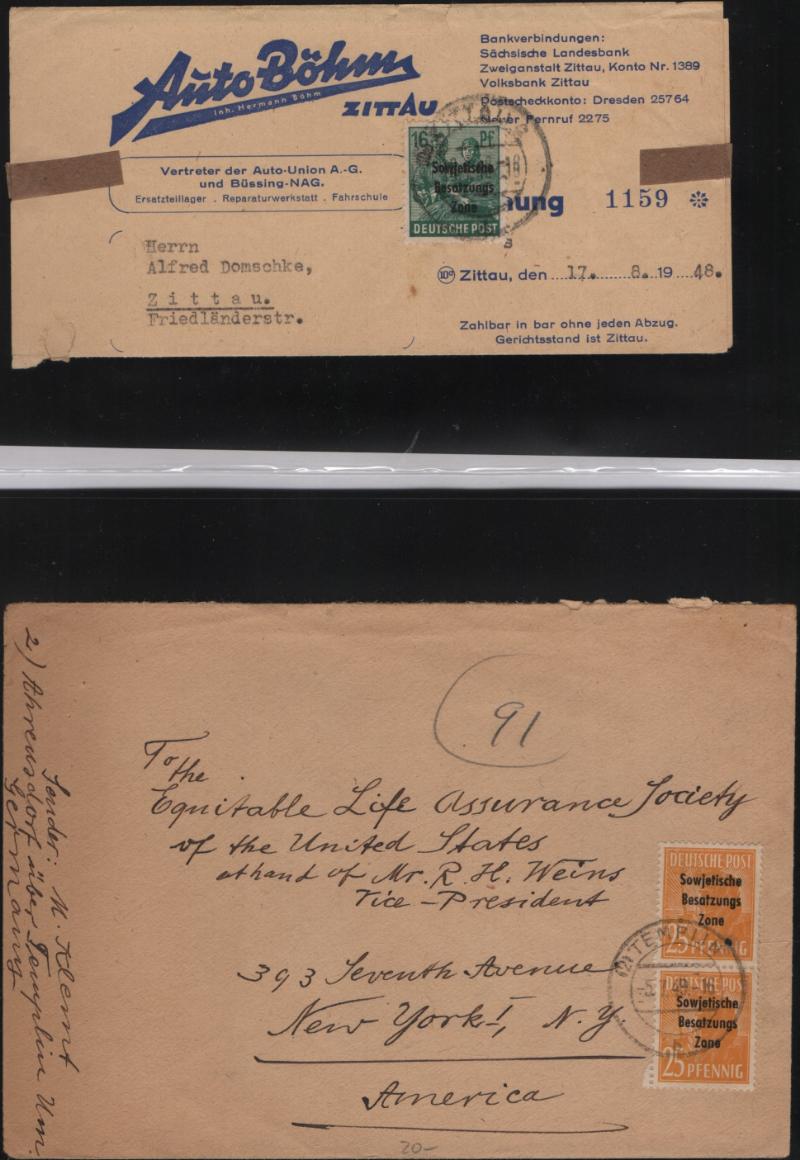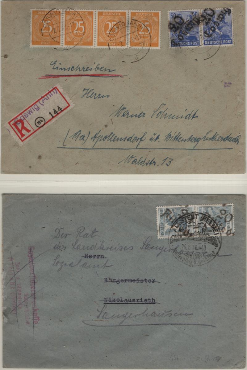 overprints incl mixed frankings, 30pf postal card w/ misplaced ovpt (P32); Famous People issue w/ couple mis-perfs, couple Leipzig Fair cards, Goethe S/S NH, several other covers; (Image) (imageb)