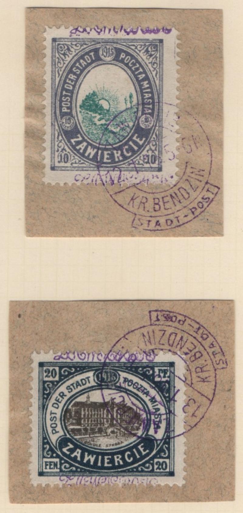 Zawiercie Locals, 10f and 20f, each tied to piece by Jan 1916 local Stadt-Post cds, control mark in violet (Michel #1 II €200, #2 II not valued used) VF (Image)