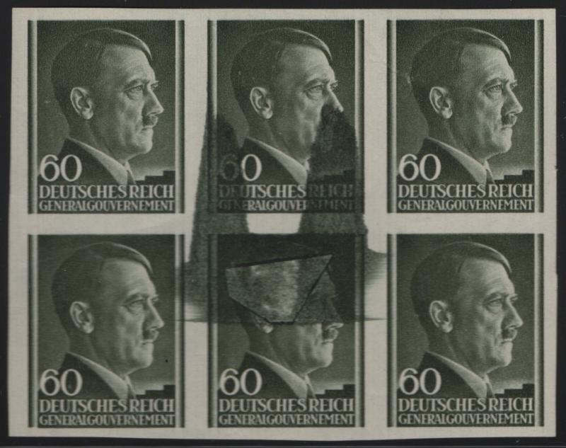 N89 VF Hitler 60gr dark olive, imperf block of (6) w/ foreign matter on plate causing large splotch of ink; a few understandable wrinkles, striking error (Michel 111 U)