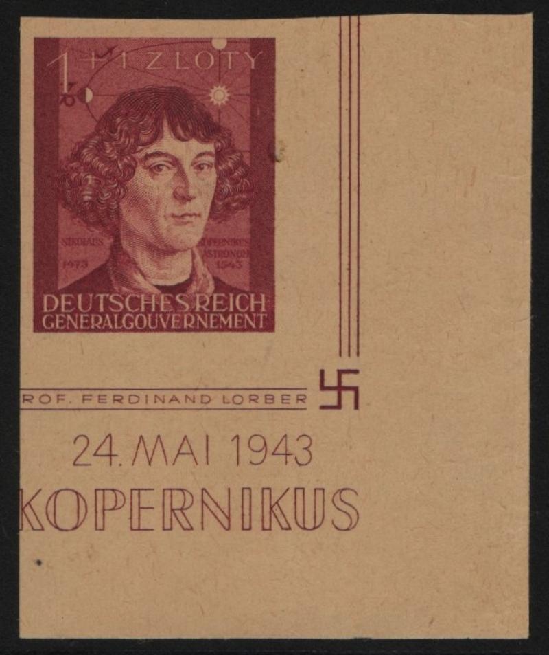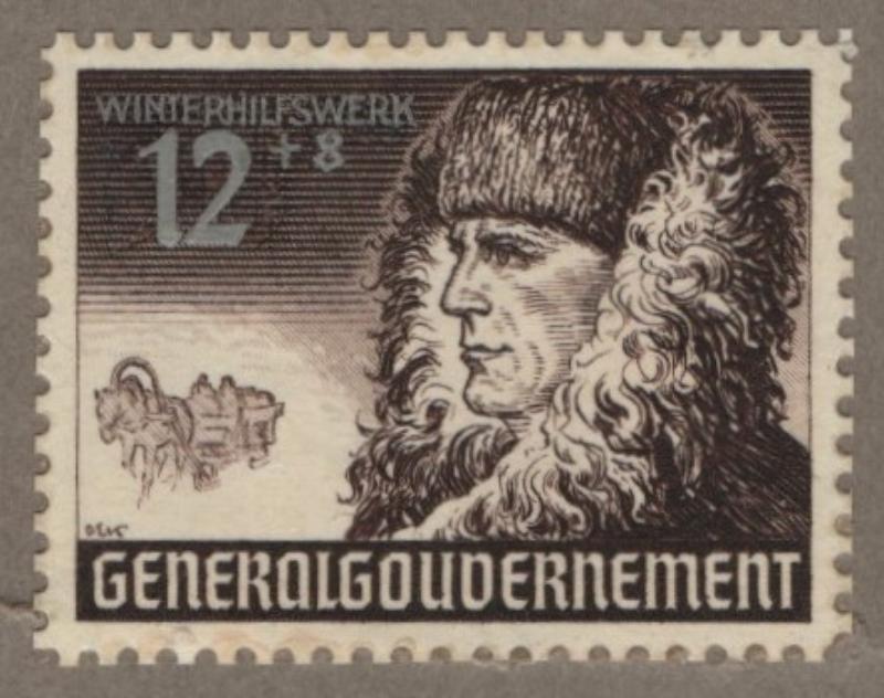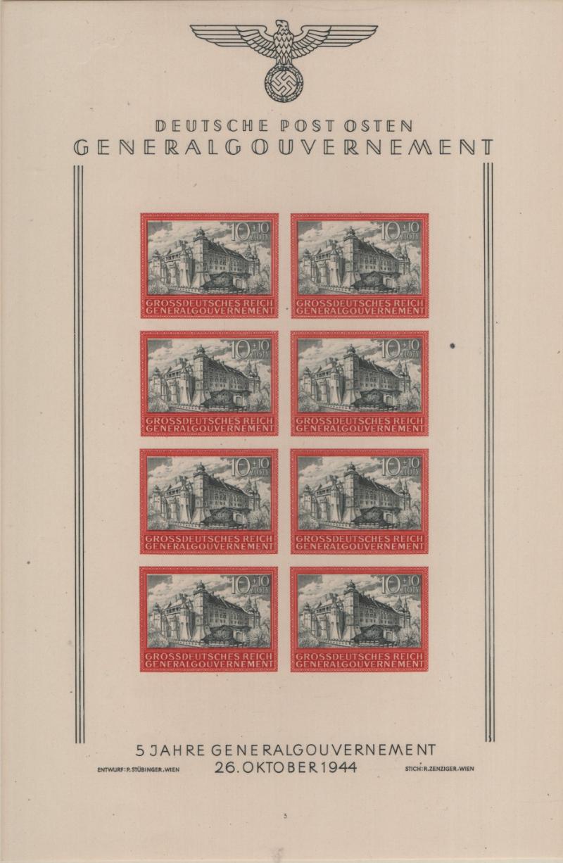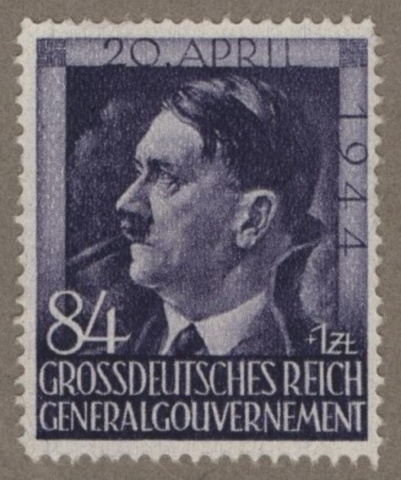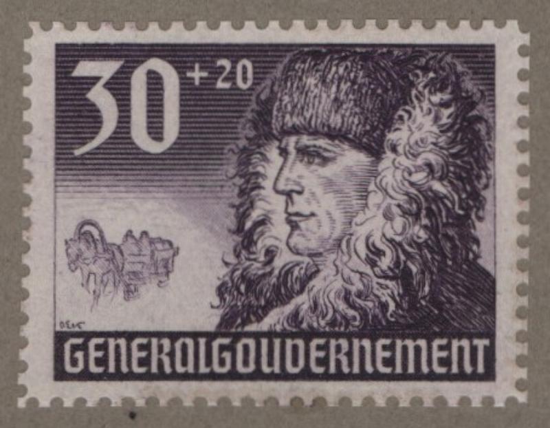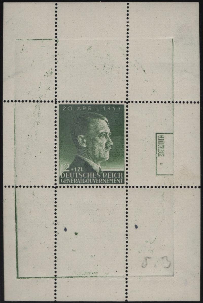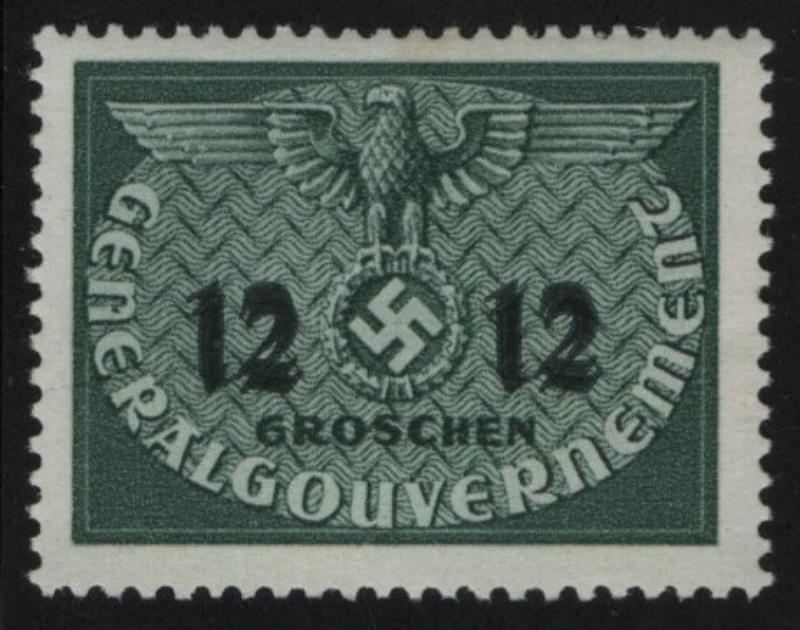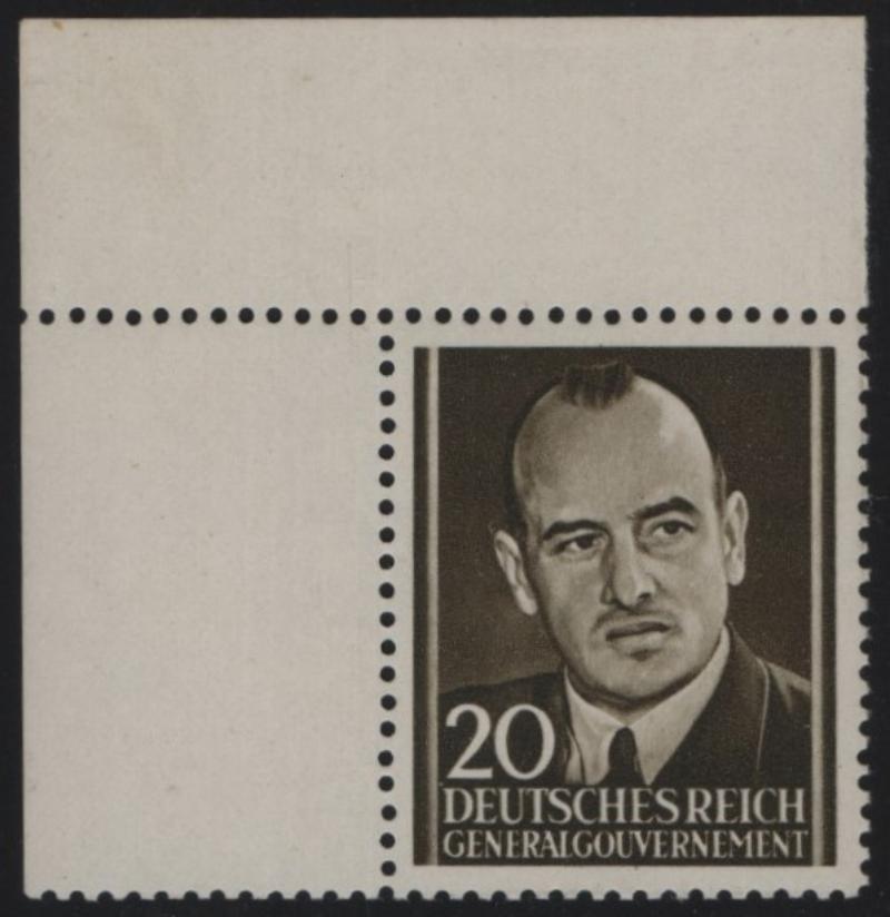 British forgery, 20gr stamp showing Hans Frank, the head of the Generalgouvernement, dark olive green, perf 12½, UL corner margin single, fresh, NH, VF+, RARE (Michel 33A)