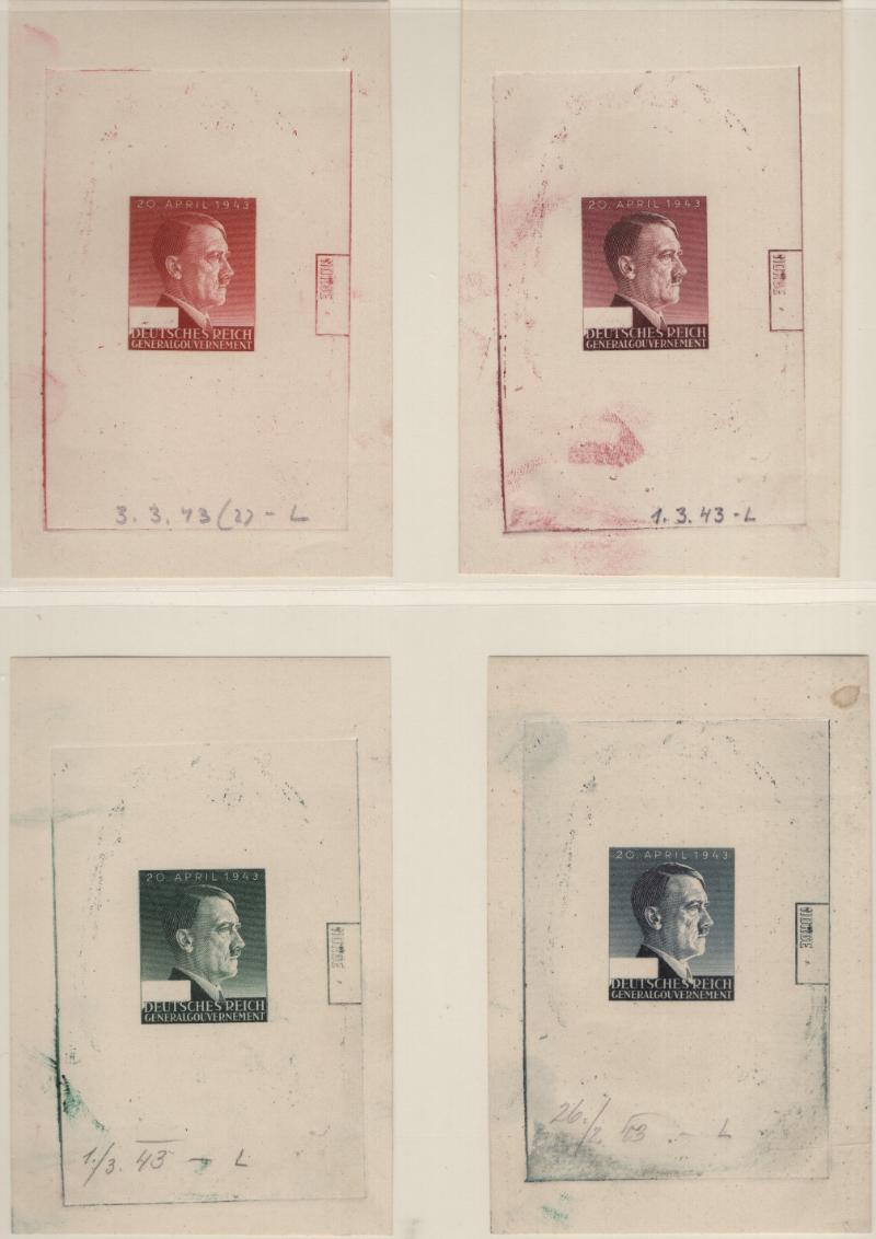 RARE Set of (4) trial color die proofs for the 1943 Hitler Birthday semi-postals, each on gummed stamp paper approx 74 x 111mm, die measures 59 x 89mm, pencil notations & dates in margin, proofs have no denominations, four different colors incl
