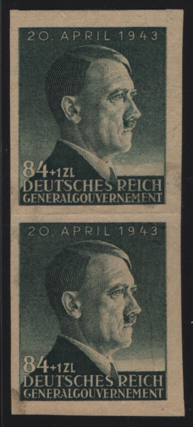 NB26 F-VF Hitler 84gr+1zl myrtle green, vertical imperf pair on yellowish stamp paper w/o gum, some soiling on reverse & two small thins, likely from removal from card (Michel 103 P4) SCARCE (Image)