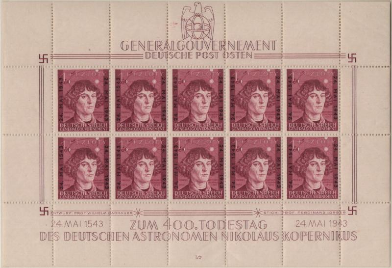 NB27 Copernicus 1zl + 1zl dark rose carmine w/ black overprint honoring his 400th death anniversary, in miniature sheets of (10); Complete set of (8) different sheets, four section numbers for both printings, marked at bottom of sheet selvage;