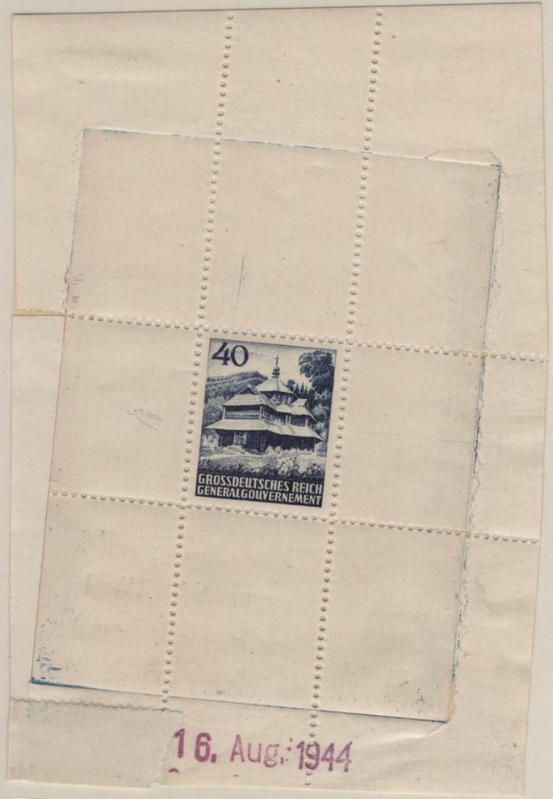Unissued 40gr blue, Wooden Orthodox Church in Tatariv, Ukraine, die proof on gummed stamp paper, perf 14¼, strong die punch reinforced by printer using selvage on reverse, dated 16 Aug 1944 at bottom (Michel III P7 CV €2200 for no gum, €2800 for NH);