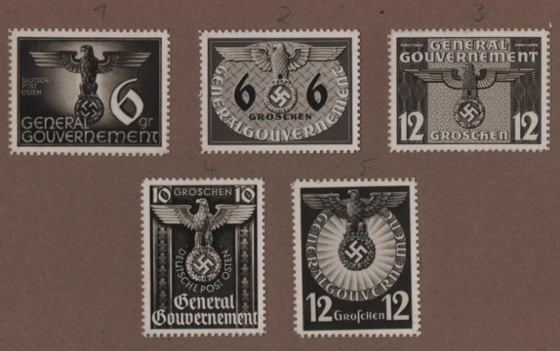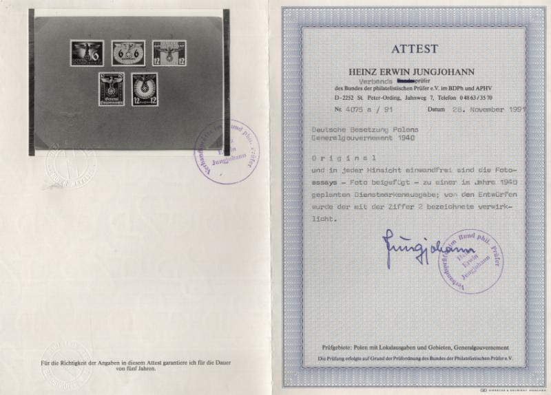 (5) different photo-essays for Generalgouvernement Official stamps, perforated and affixed to card which has embossed Staatsdruckerei Wien seal; the 2nd design was chosen for 1940 Issue NO1-15; 1991 Jungjohann photocert; VF (Image) (imageb)