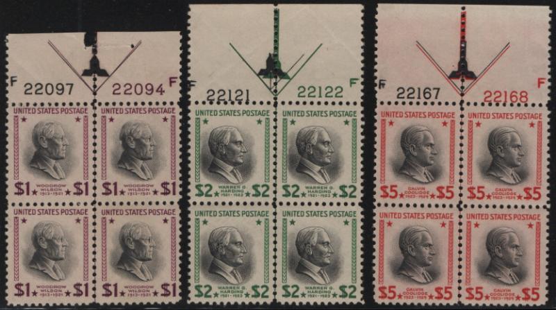 832-834 VF NH, $1, $2 & $5 Prexy PBK, $1 w/ selvage damage (Image)