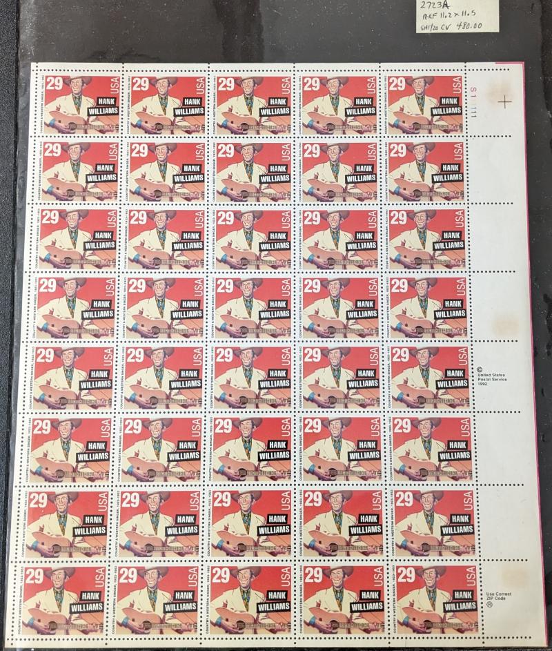 VF NH, Sheet/40, perf 11.2 x 11.5, 29¢ Hank Williams, three toning spots in margin (Image)
