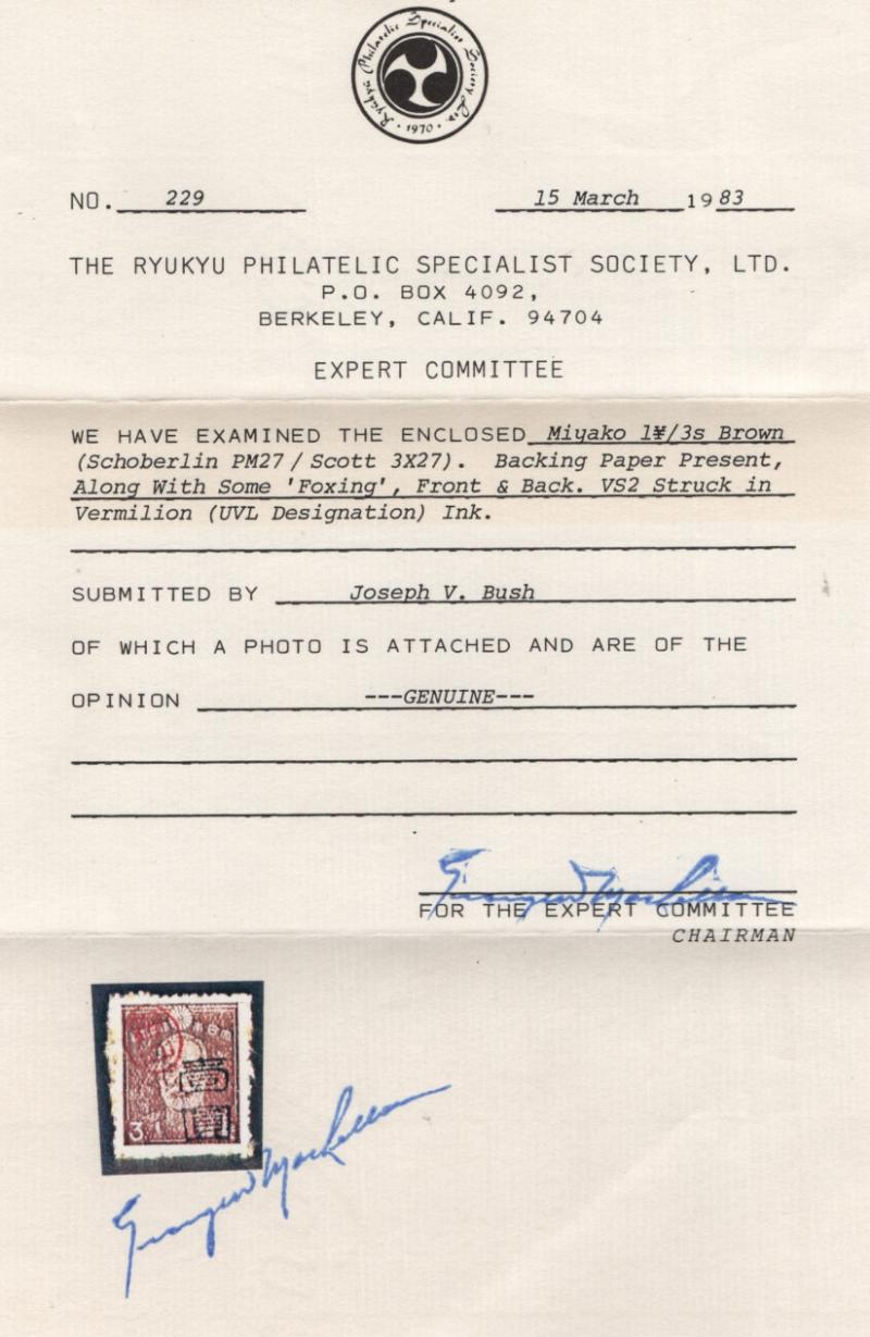Miyako Provisional ¥1 on 3s brown, vermilion seal, full backing paper, some toning, genuine w/ 1983 RPSS Cert (Image) (imageb)