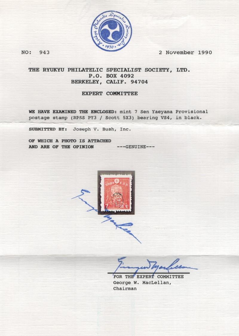 Yaeyama Provisional 7s orange vermilion, unused w/o gum, F-VF, genuine per 1990 RPSS Cert (Image)