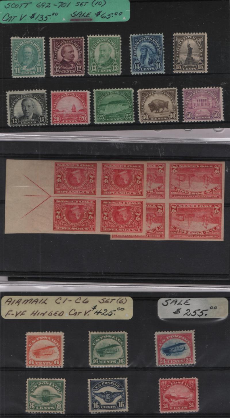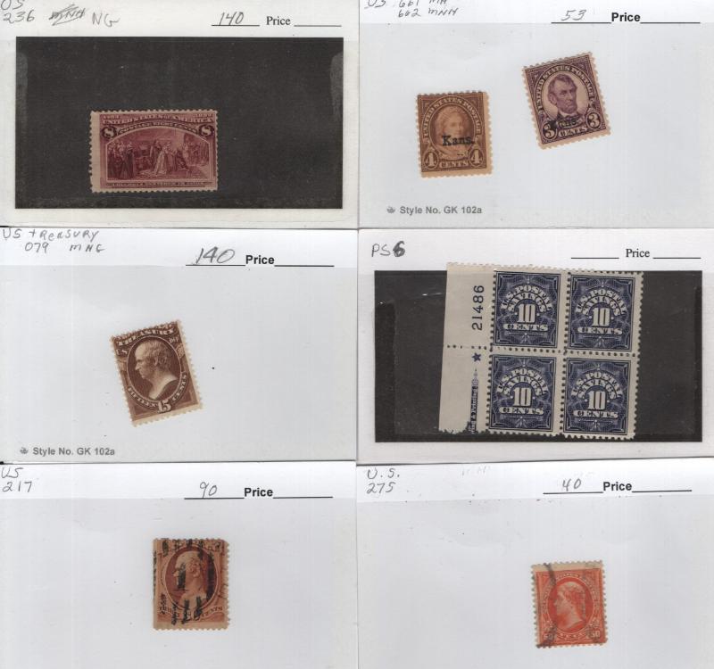 501 image Show Display cards (13) incl Unused: #230-37 LH, 294-99 (5¢ & 10¢ H, rest NH), 294-99 H (10¢ pulled perf), 371 NH arrow Blk, 373 NH Blk, 692-701 LH, 803-31 NH (2), 839-51, 1030-53 LH (2), C1-6 H; Used: 1053 Blk; gen F-VF (Image) (imageb) (All Images)