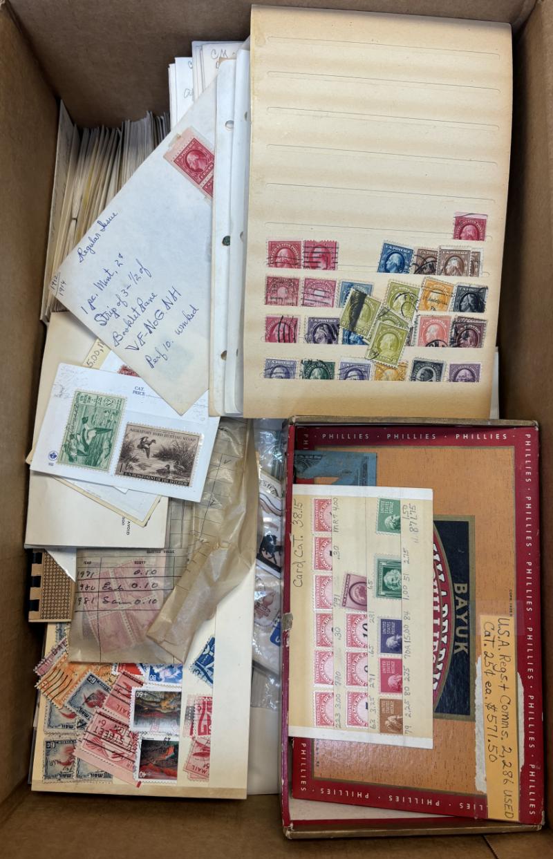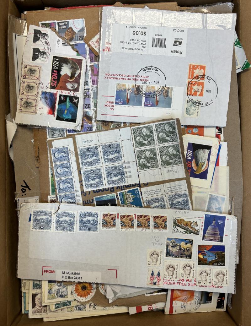 541 image Abt 10 lbs on paper, much high values on large pieces (large envs or cardboard box), sgls, multiples, many from Prominent Americans to recent Express Mail, also nice mix of commems & regs, gen F-VF (Image)