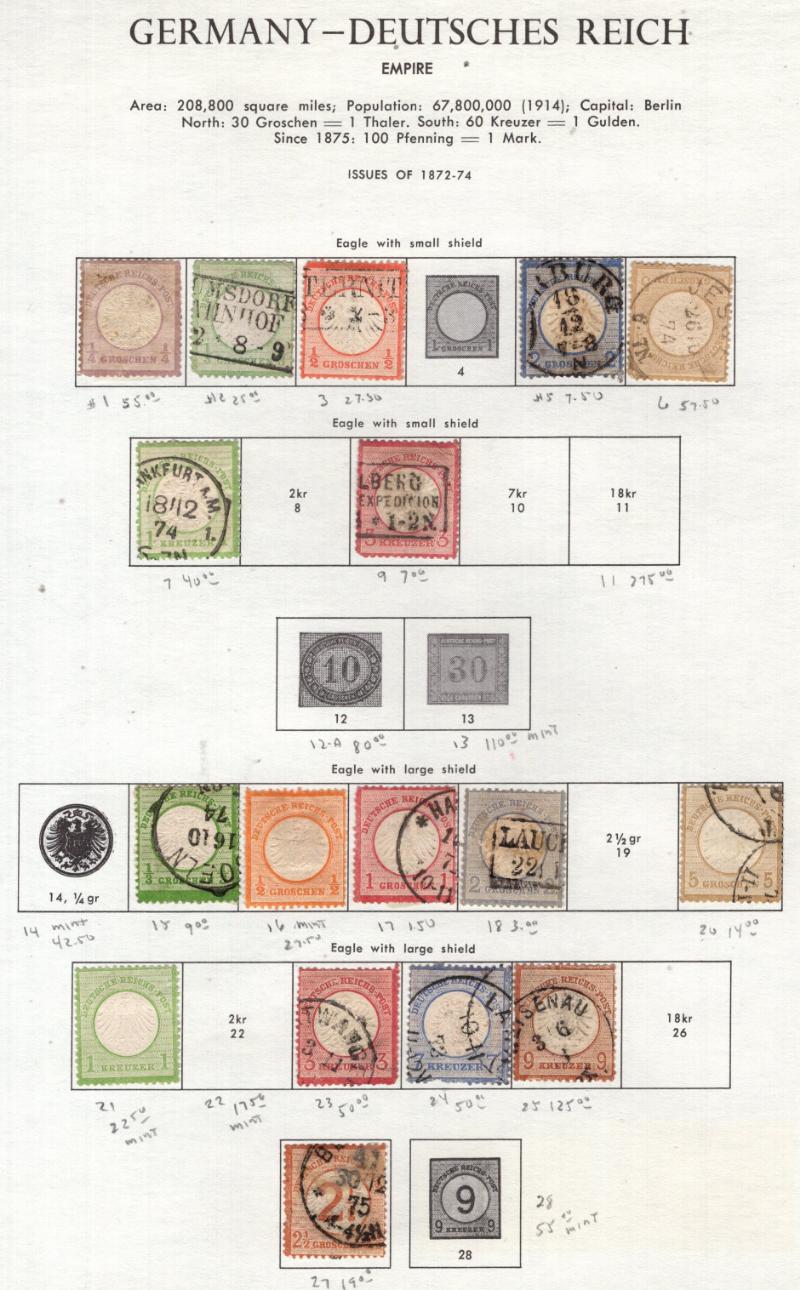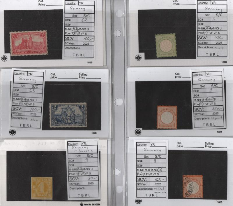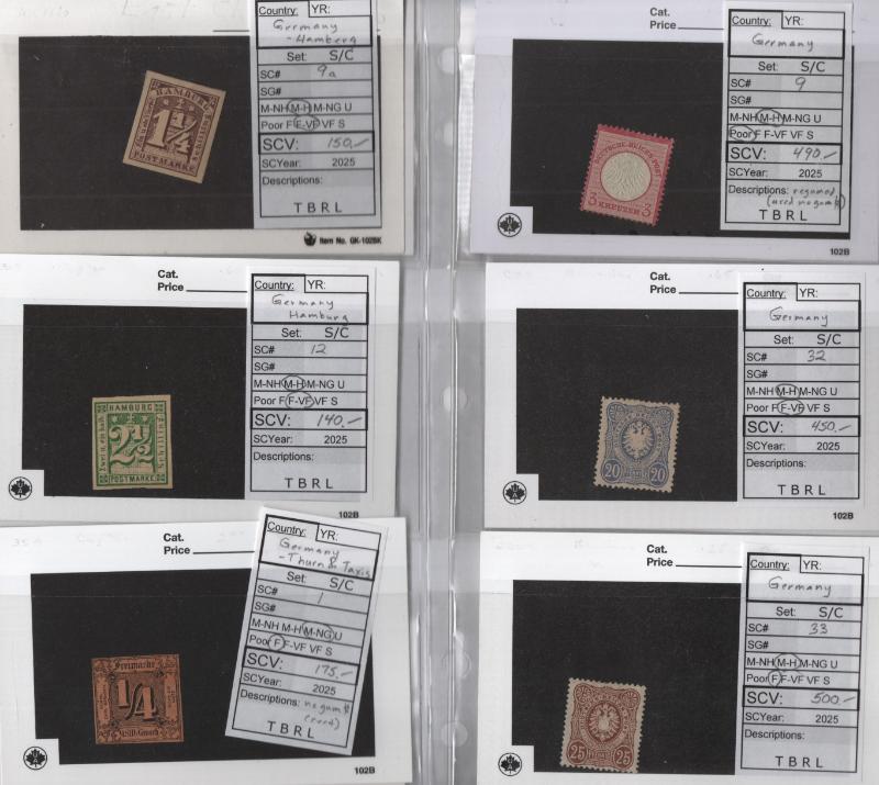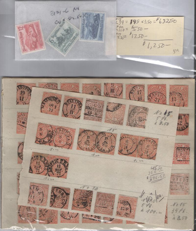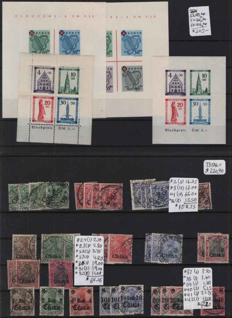 (100s) */O, few dup, old time dealer group, owner IDed CV (NV), Germany B134-36 NH, Baden #5NB4a (2) NH, 5NB8a (2) NH, 5NB8b (2) NH, North German Conf w/ dup, stock CV$1,250, Germany China used #1-4, 6, 24-27, 30 (2), 35 (2), 32, 41, 42, Poland