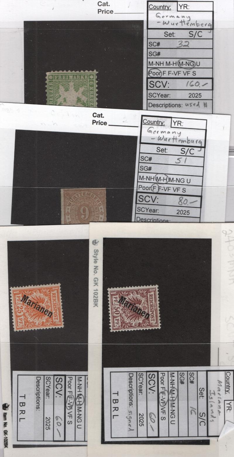 Selection (19) diff better mainly unused 19th Cent on cards incl used #8 & unused 2, 3, 9, 32, 33, 62-63, Bavaria 9, Hamburg 9a, 12, Thurn & Taxis 1, 5, 7, 45, Wurttemberg 32, 51 & Mariana Is 15-16, cond varies, some NG, etc appear F-VF H (5 items w/