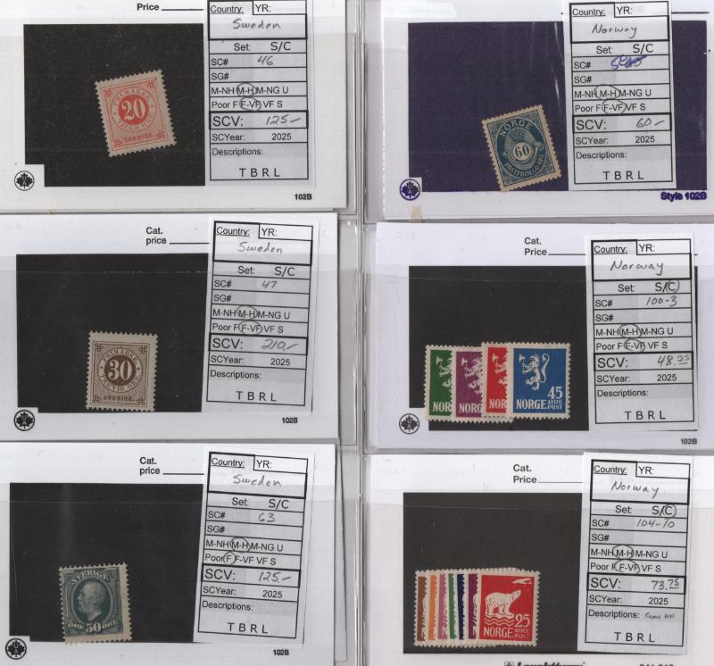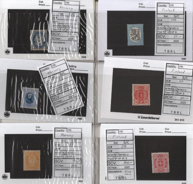 Mostly Unused Selection (25) diff better pre-1940 on cards Incl Finland #9-10 w/ Certs, 23, 40, 100, 175, Sweden 46, 47, 63, O19, O21, O23 & Norway 4, 5 (NG w/ Cert), 31, 38, 39b, 52, 57, 58, 100-03, 104-10 & Used: 28, cond varies flts to mainly F-VF