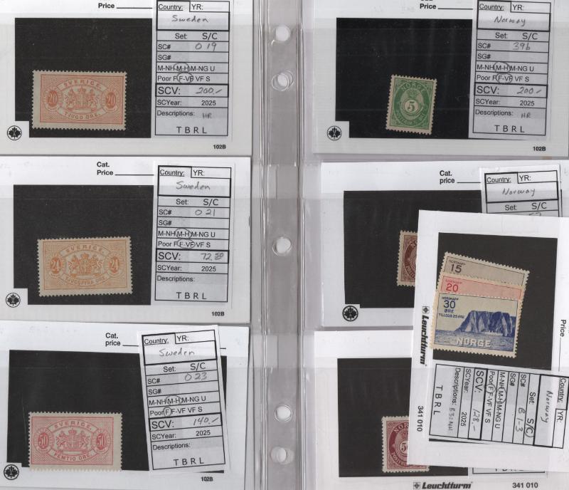 B24, B50-52 & used 2, 5, 11-15, 16-20, 22-34, 111-14, B5-8, B26, O9-19, Sweden 1855-1968 used #8-12, 14, 18, 26, 27, 37, 44, 67-73, 165, 194-96, 213-20, B1-10, B12-20, C1-3 & so much more, dealers can break this album down into (7) country lots, few