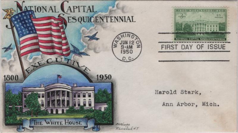 #990 3¢ White House neatly addr, light flap mark, corner glue marks on back, F-VF (Image)