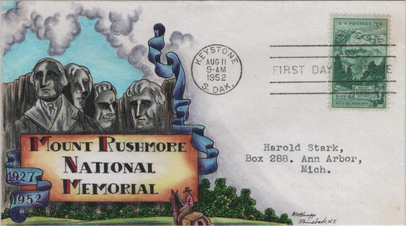 #1011 3¢ Mt Rushmore, neatly addr, corner glue marks on back, F-VF+ (Image)