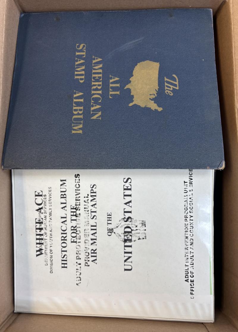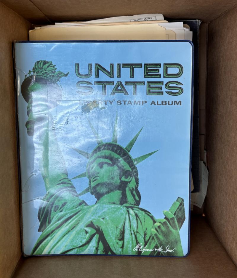 446 Large Accum donated material, incl (7) USPS brown binders w/ 1982-89 souvenir pgs, likely fairly cplt; some better selections & sets on counter book pgs US & CZ; selection Duck Stamps, several used incl one on license, a few unused as well but w/ cloudy gum or hinged; baggie of Christmas & wildlife seals; small baggie supplies incl unopened pack of Denison hinges; several US albums w/ normal coverage late 19th to mid-20th Cent */O, several annual year sets w/ stamps from 1970s-90s; extras stamps on manila pgs incl airmails some beginner's literature, more; likely over $100 in FV (proceeds benefit PA Brethren retirement community stamp club)