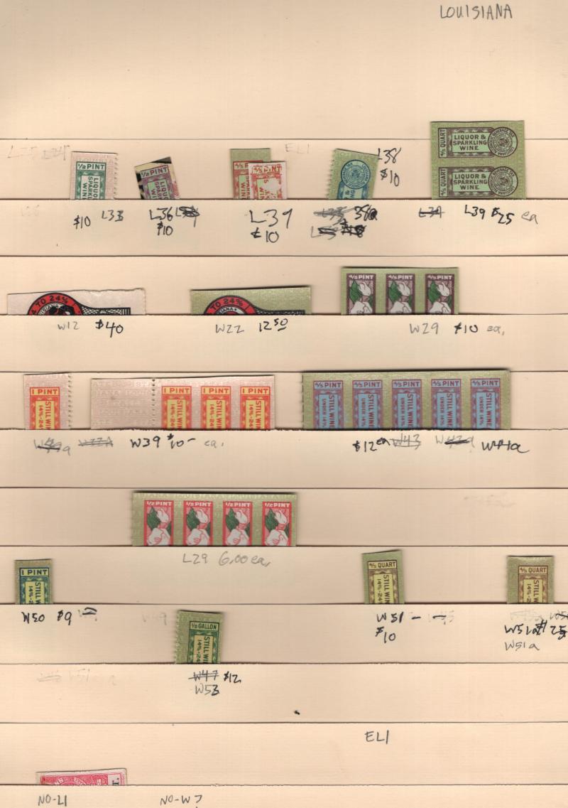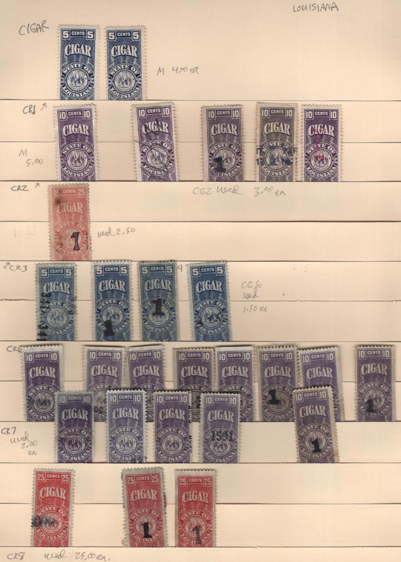 543 image LOUISIANA STATE REVENUES Accum (100s) mostly unused 20th Cent in abt (30+) IDed manila stkpgs incl sgls, pairs, Blks & scrap, types incl Bedding Inspection, Cigar Tax, Export Liquor Inspection Fee, Fed Inspection, Insecticide or Fungicide Tax incl provisionals, Liquor, Malt, Soft Drink, Tobacco & Wine tax; owner's CV $1,950 (NV); some light dup; gen F-VF H/NH (Image) (imageb) (imagec) (imaged) (All Images)