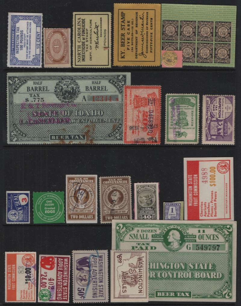 545 image STATE REVENUES Accum/Dealer Stock */O (1000s) 19th to most 20th Cent, most sorted on #2 dealer pgs in (6) binders, much IDed, w/ modest dup, also baggie of loose w/ mostly Tenn; incl AL, AR, ID, IL, IN, KY, LA, NC, TN & abt 1/2 of lot is Washington; mostly sin taxes (alcohol, tobacco etc) but also feed, fertilizer & other agriculture, some Wash salmon fishing on licenses; better items throughout, some multiples; cond varies, expect some faults but better than usual revenue condition, gen F-VF most NH (Image)