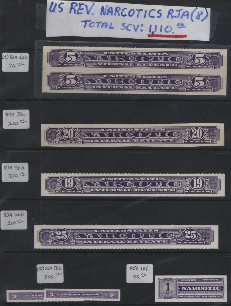 546 image Selection (8) NH Narcotics revenues on stkpg: RJA62b V pair, RJA70a NGAI, RJA78b (2), RJA98b, RJA100b & RJA106 NGAI; all fresh VF (Image)