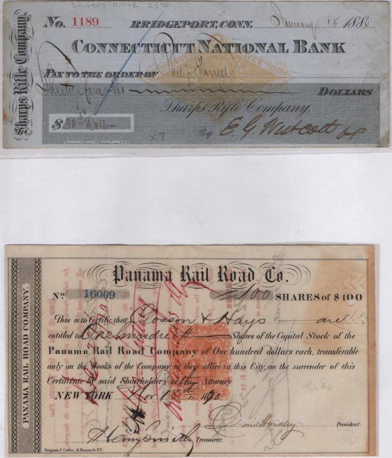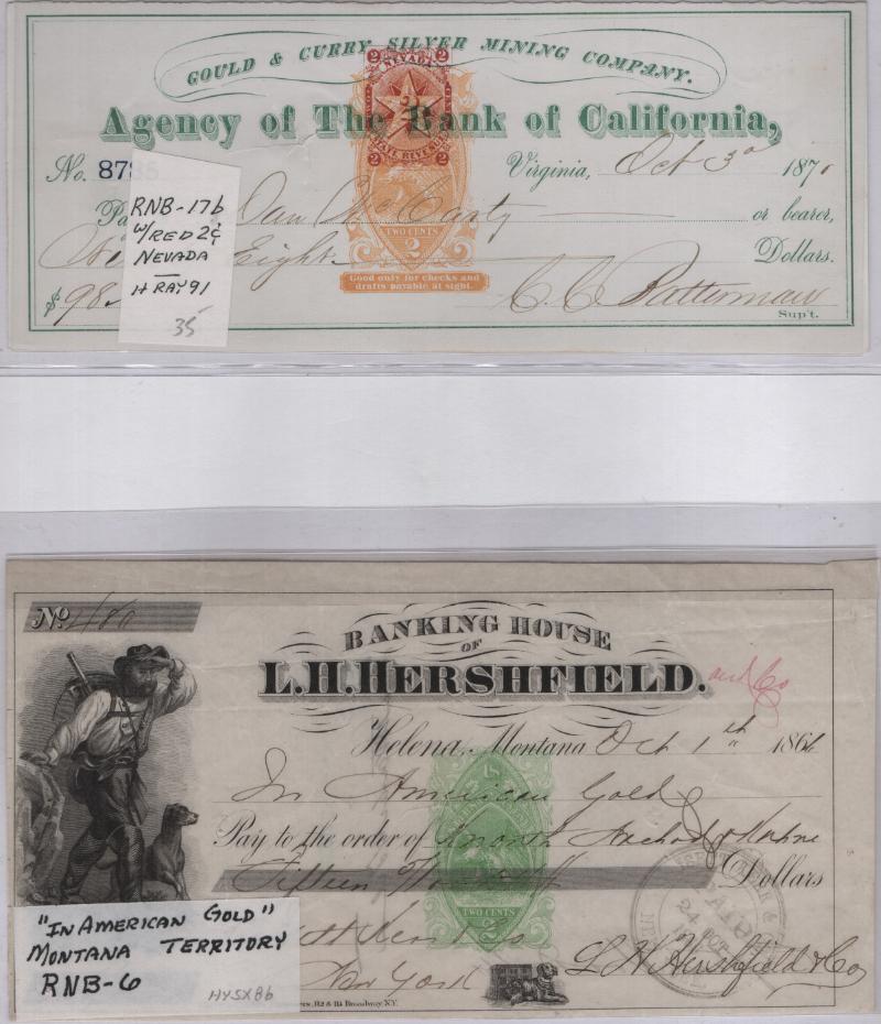 549 image Group (25) revenue stamped paper (#RN) */O 1860s-1900s, all diff, most w/ attractive vignettes, nice group of less common RN's on checks, drafts, receipts, parlor car ticket; incl RN-X5 on unused Postal Telegraph-Commercial Cable Co telegram 190-, RN-X5a Pere Marquette parlor car ticket, RN-B6 on Helena Montana draft w/ vignette of miner & dog payable "In American Gold", RN-B2 to B11 on checks/ drafts, RN-B17b w/ 2¢ Nevada on 1870 Gould & Curry Silver Mining Co check, RN-P5 on Rocky Mountain Natl Bank Cert of Deposit, RN-B20 on unused receipt (check size) of John B Murray Banker, RN-G1 on 1880 Sharps Rifle Co check Bridgeport CT, RN-T4 on cancelled Panama RR stock Cert-1870; cond varies but much better than most similar groups, small edge flts, toning to VF (Image) (imageb) (imagec) (All Images)