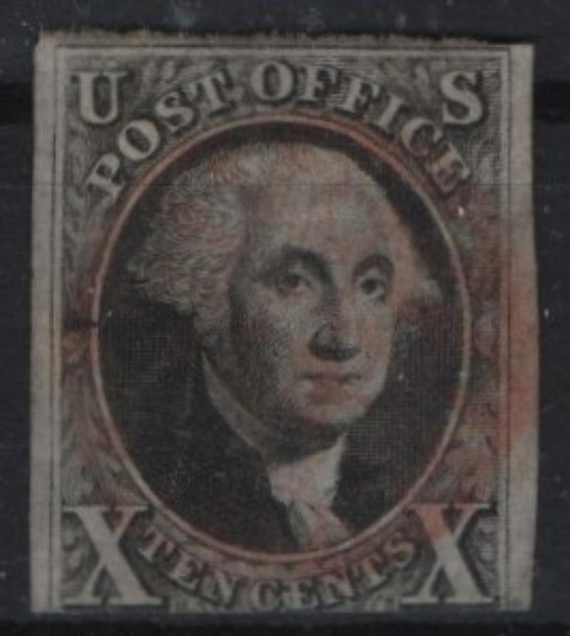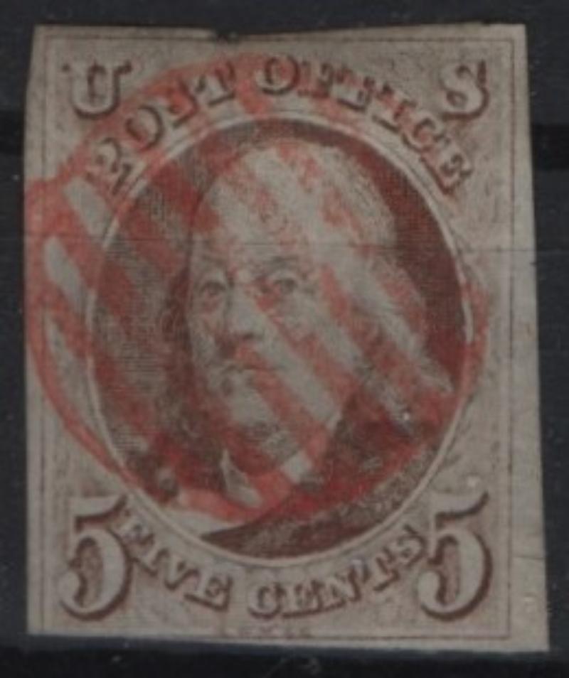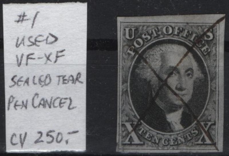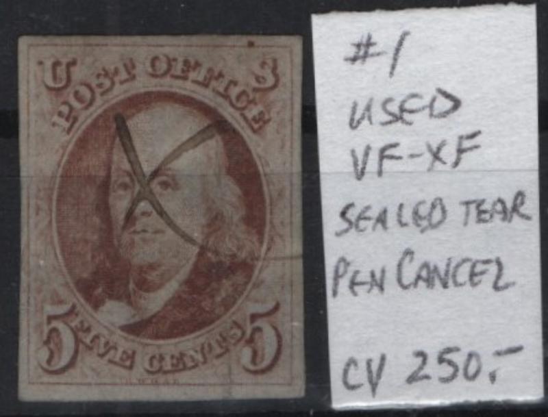 554 image Group (7); #1 (5) & #2 (2) used on approval card; incl (2) #1 VF w/ red grid cancels, (2) #1 F-VF w/ red grid cancels, #1 & #2 w/ pen cancels-5¢ w/ sealed tear, 10¢ w/ corner repaired, #2 Fine red cancel w/ large margins at sides but in at bottom (Image) (imageb) (imagec) (imaged) (imagee) (imagef) (imageg) (All Images)