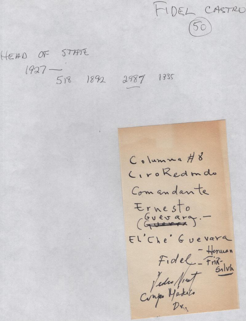 (4) Slips of paper w/ handwriting & signatures of socialist revolutionaries Che & Fidel; slip of paper w/ names incl Fidel, unsure if signature; (3) slips of paper w/ writing & signature Che, two dated 1958; from huge autograph estate but w/ no