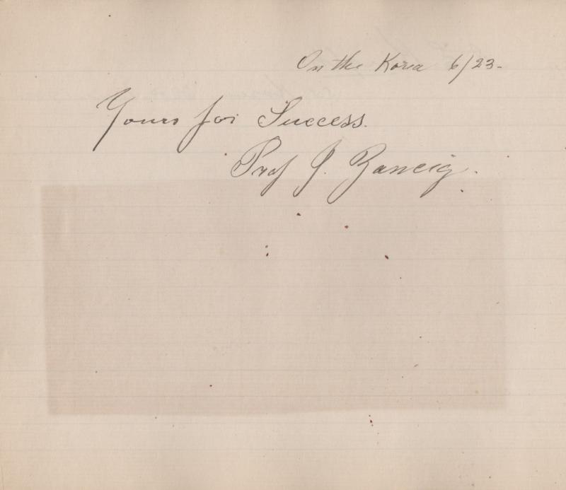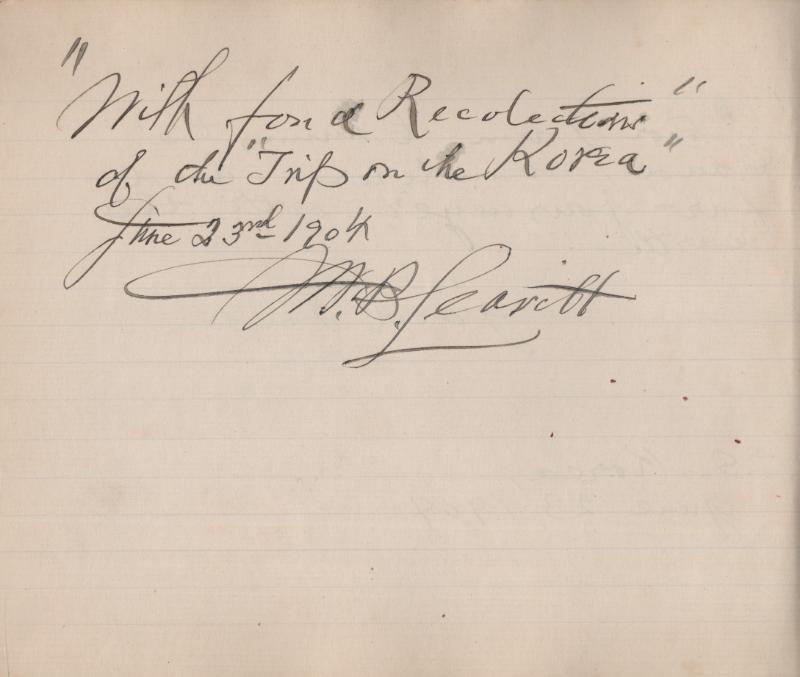 correspondent in Japan from January to June that year, covering the war with Russia; however after three arrests he was sent home; this autograph was likely made on his ship voyage home; other autographs in the book incl M.B. Leavitt, probably the
