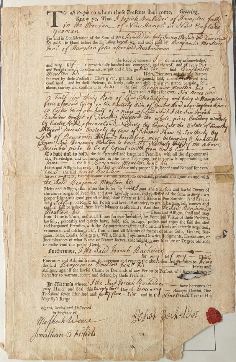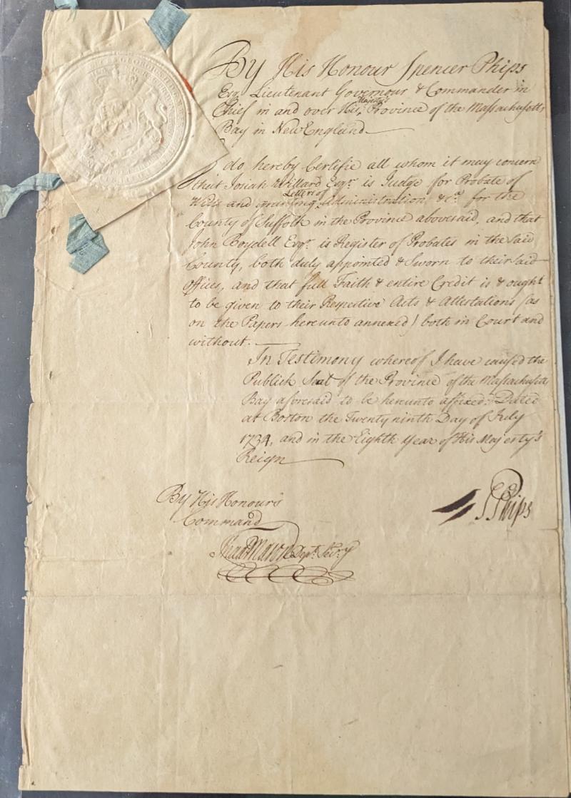 Several Early American documents w/ signatures; 1734 Document signed by Massachusetts governor Phips, appointing a judge for Suffolk County, embossed seal & ribbon; 1745 New Hampshire sale of land document, signed by Meshech Weare, future