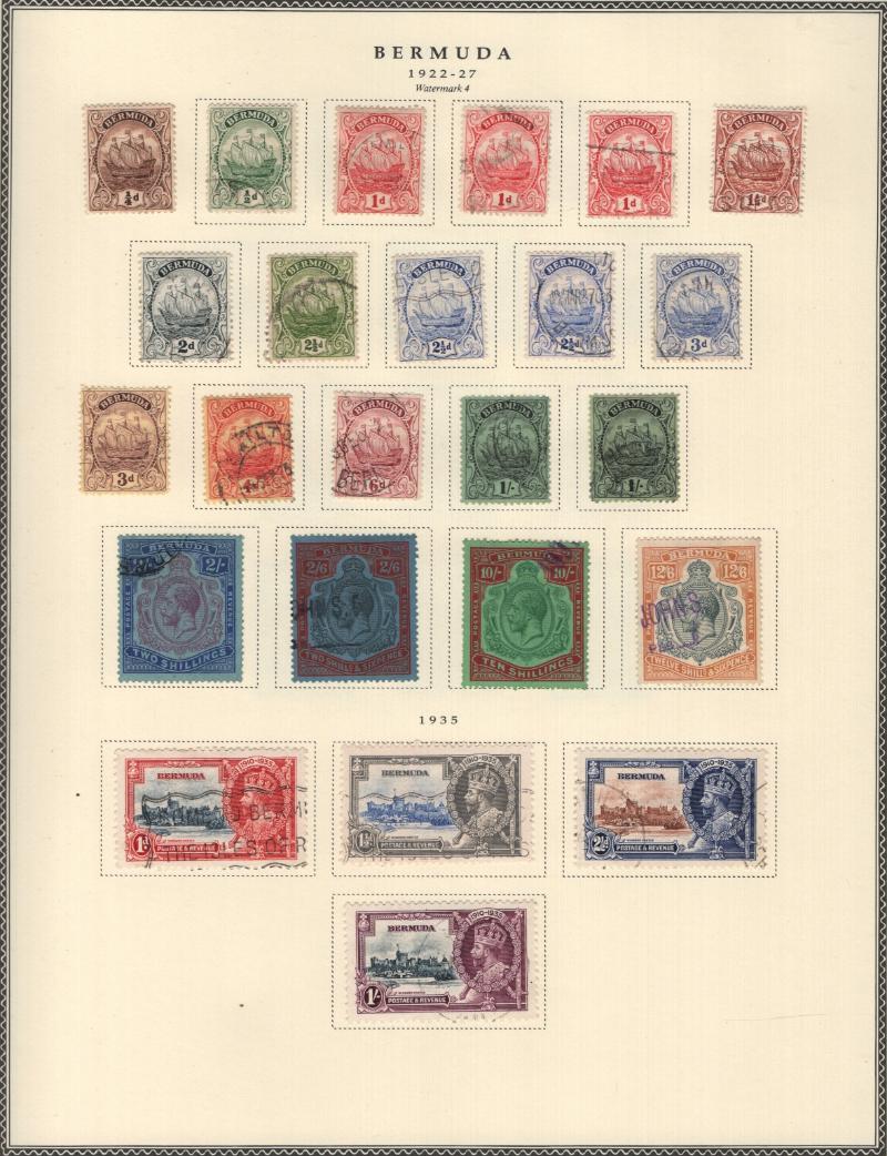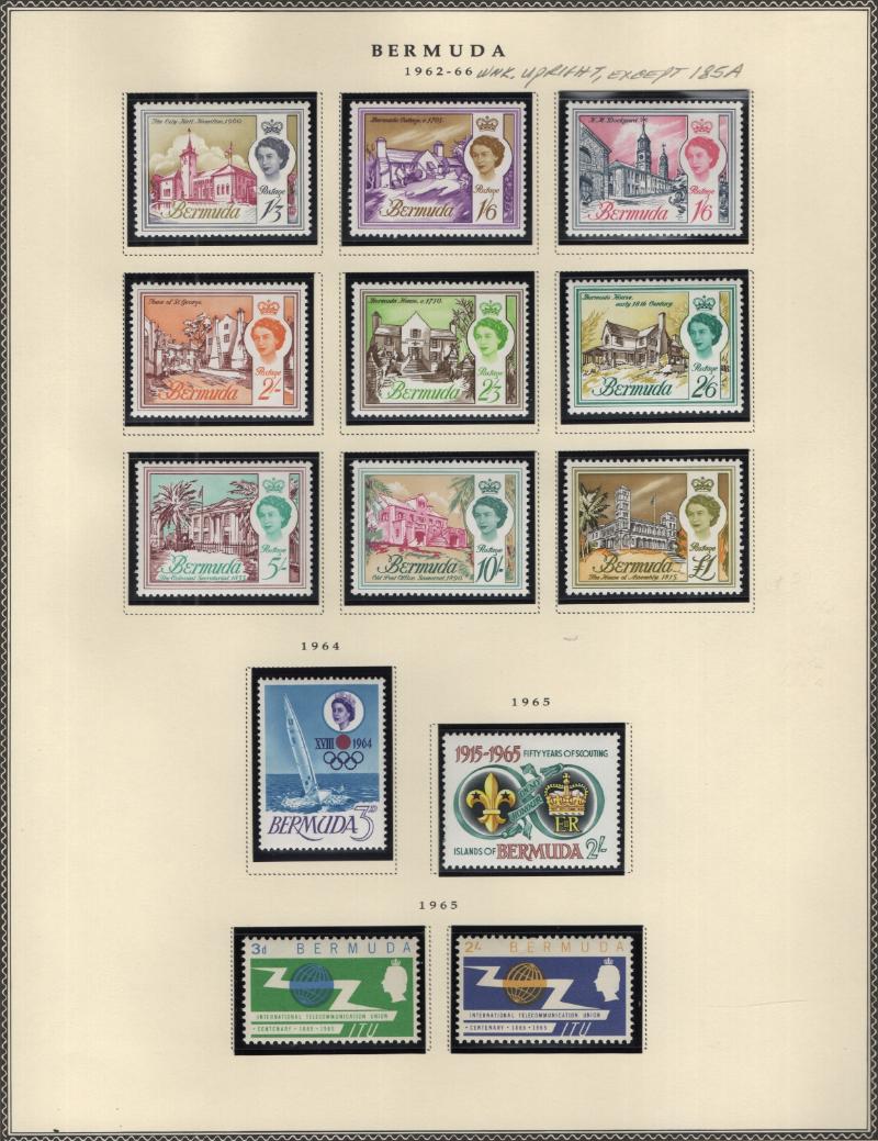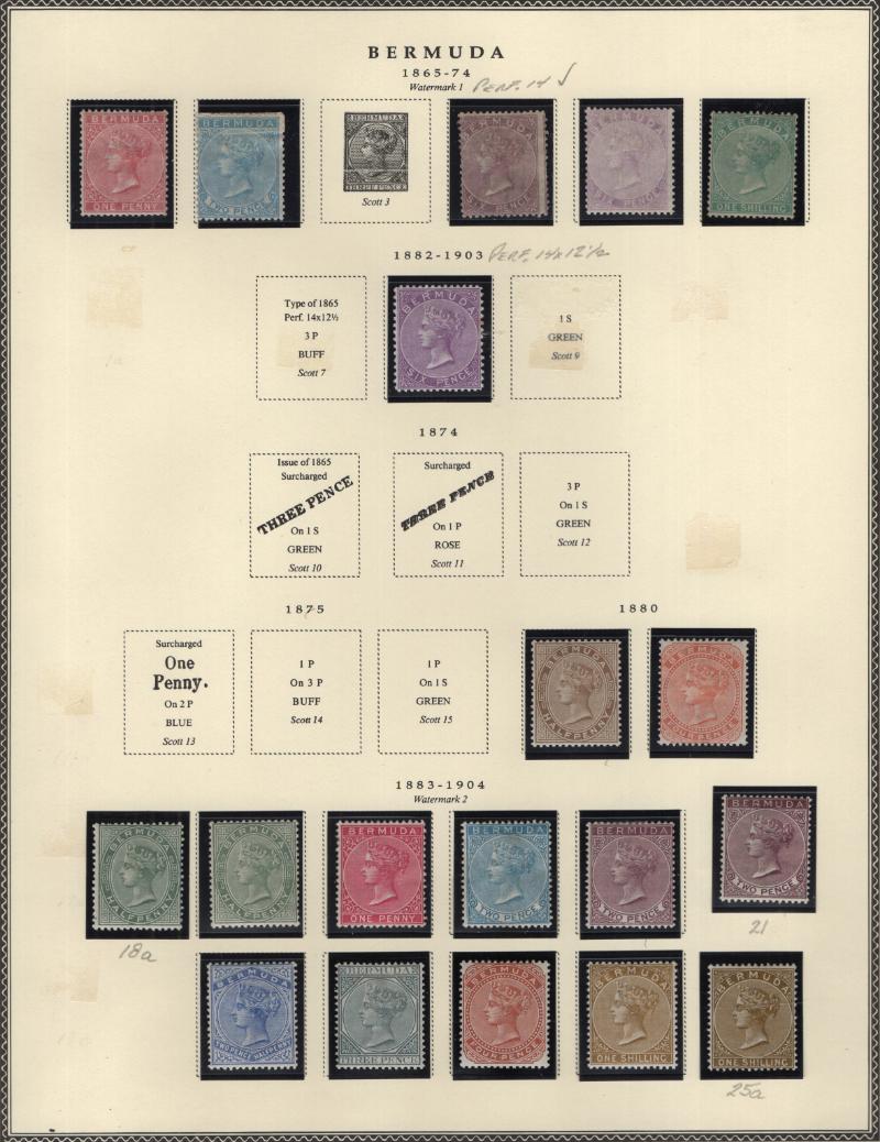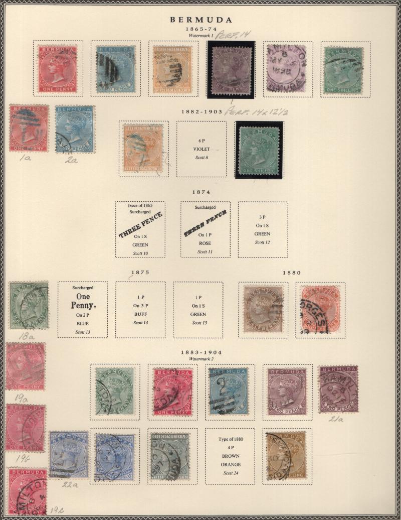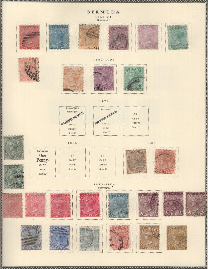 Collection (100s) all used in Scott Specialty Bermuda albums w/ pgs 1865-2004 w/ sgls, cplt sets, S/S, owner IDed incl Used: #1-6, 7-9, 16, 17, 18-25, 28-39, 40-54 revenue cancel on #54, 55-69, 71-79, 81-96 w/ revenue cancels on #95-97, 100-03,