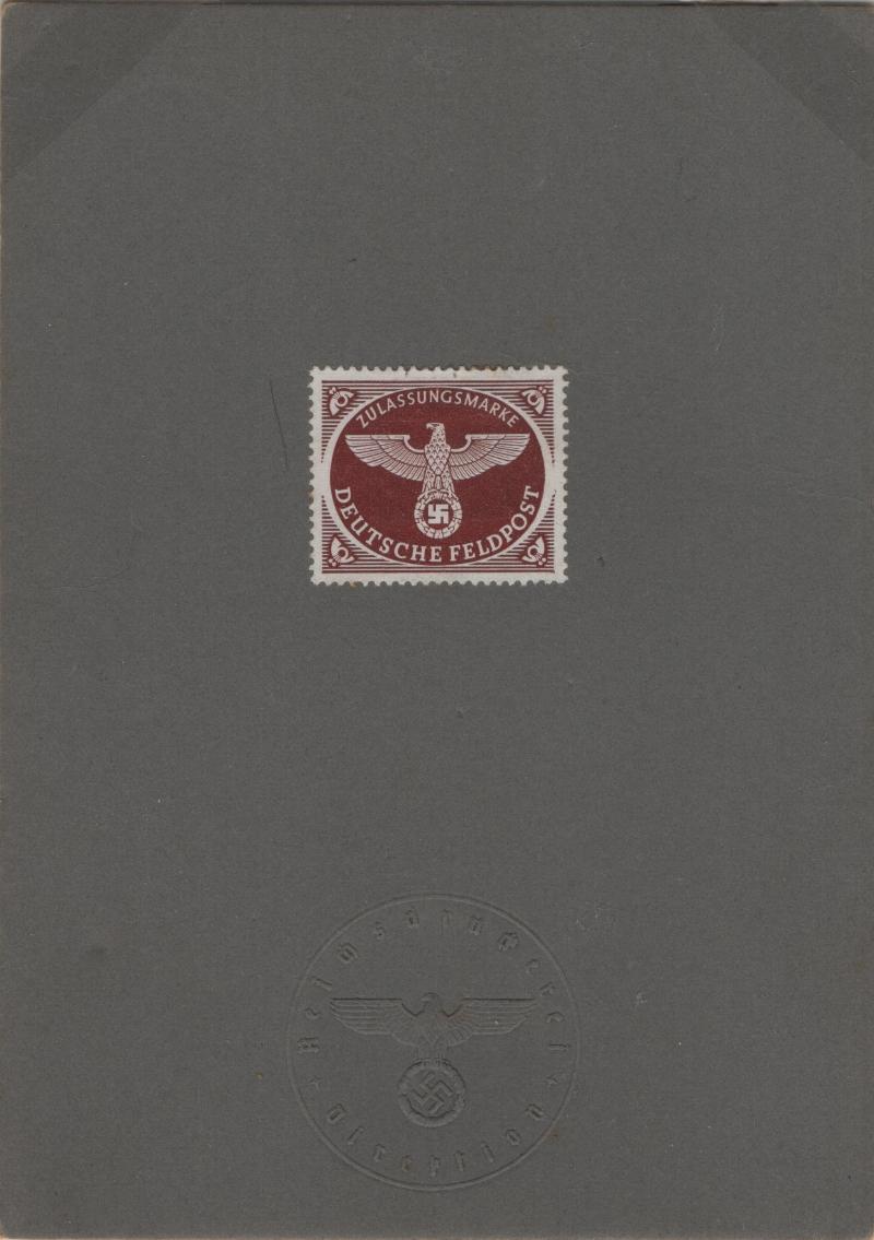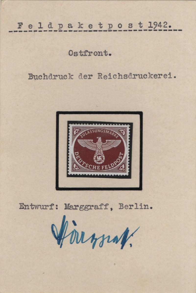 Military parcel post stamp, red brown, perforated, presentation sample affixed to thick gray card, embossed seal of Reichsdruckerei at bottom; additional smaller presentation card w/ same stamp hinged, typewritten text abt stamp & signed by designer