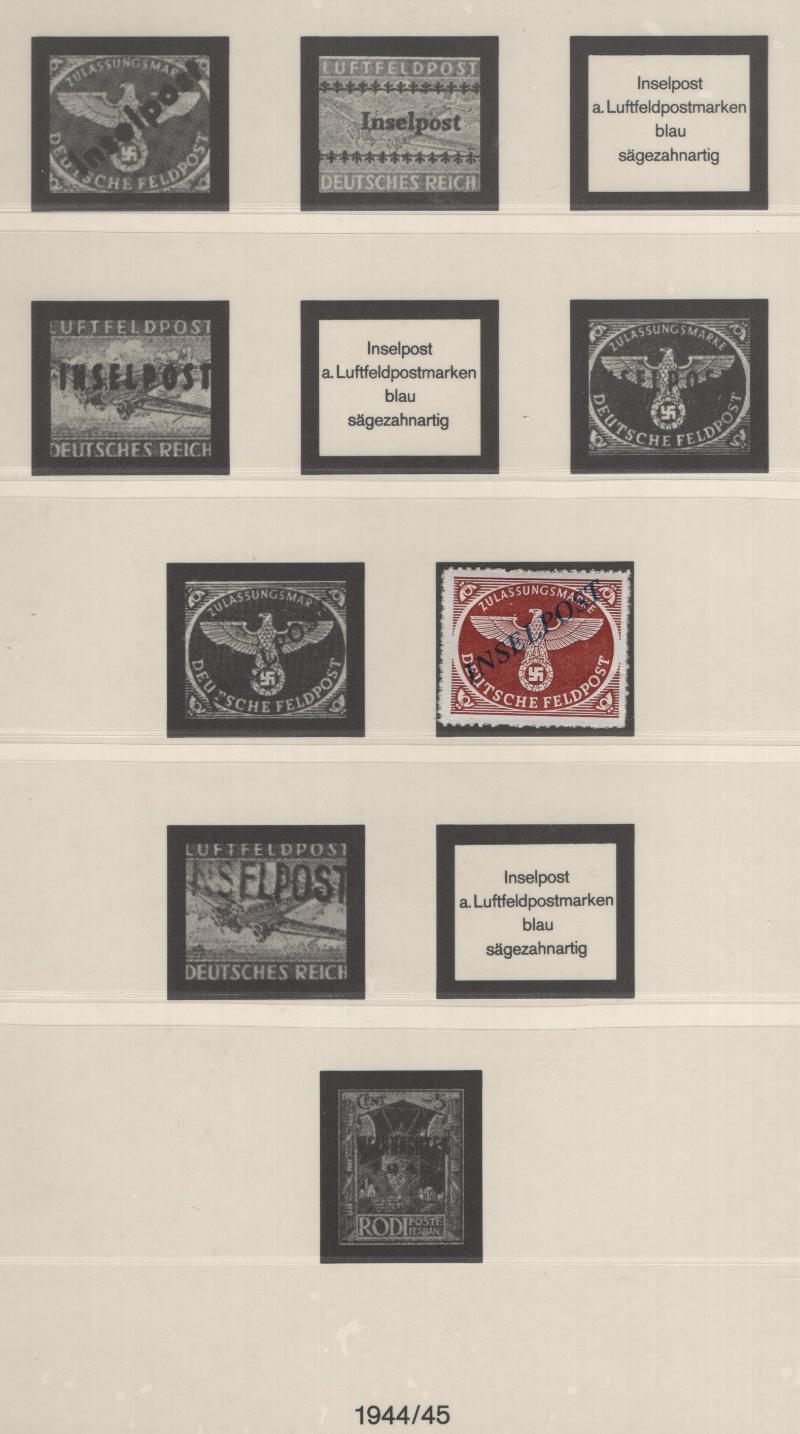 III); others unissued, possible trial prints, on 10c, 20c, 25c, 30c & 50c Rhodes stamps plus red brown Luftfeldpost stamp (rouletted perfs); an auction description & Stolow Cert state one set of (7) came from a King Farouk auction; gen F-VF H/NH