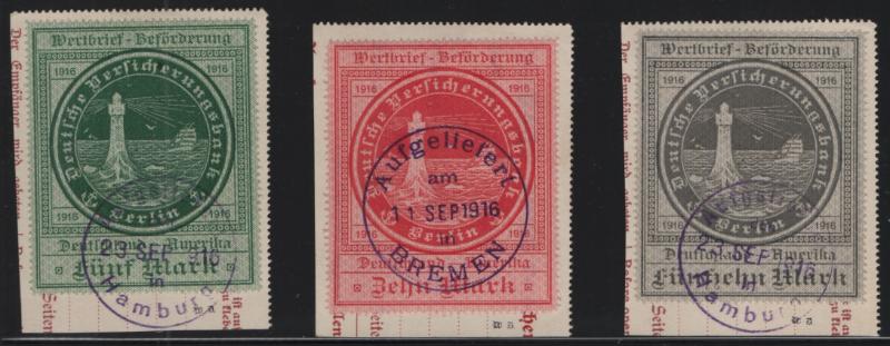 Registered mail service of the German Insurance Bank, first issue of 1916 with "Deutschland - Amerika" at bottom; complete set of (6) 5m, 10m, 15m, 20m, 25m & 50m values, each canceled or tied to piece of insurance document, September 1916 delivered