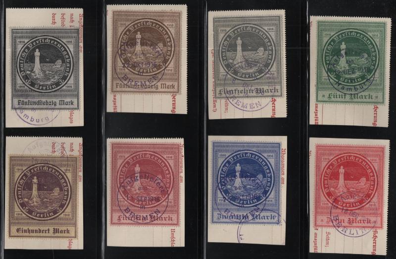 Registered mail service of the German Insurance Bank, second issue of 1916 lacking text at top & bottom, complete set of (8) 5m, 10m, 15m, 20m, 25m, 50m, 75m and 100m, each canceled or tied to coupon of insurance document, September to December 1916
