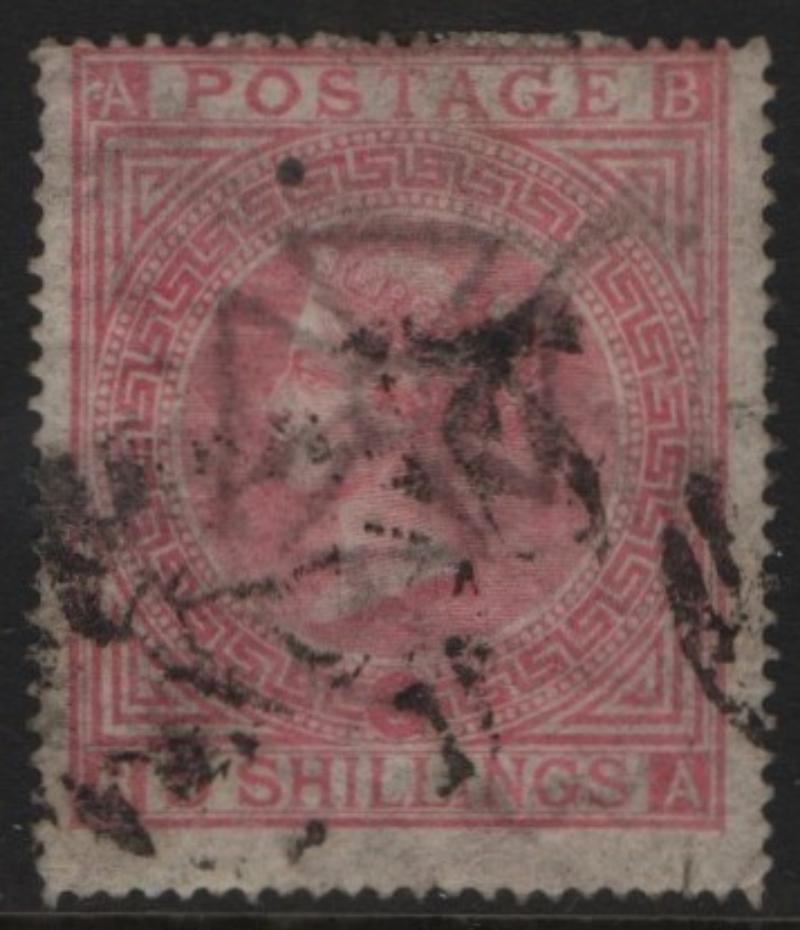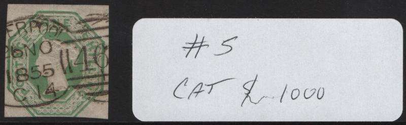 F Victoria 5sh rose plate 1, black cancel, strong wmk, three good margins, HR along top perfs (Image)