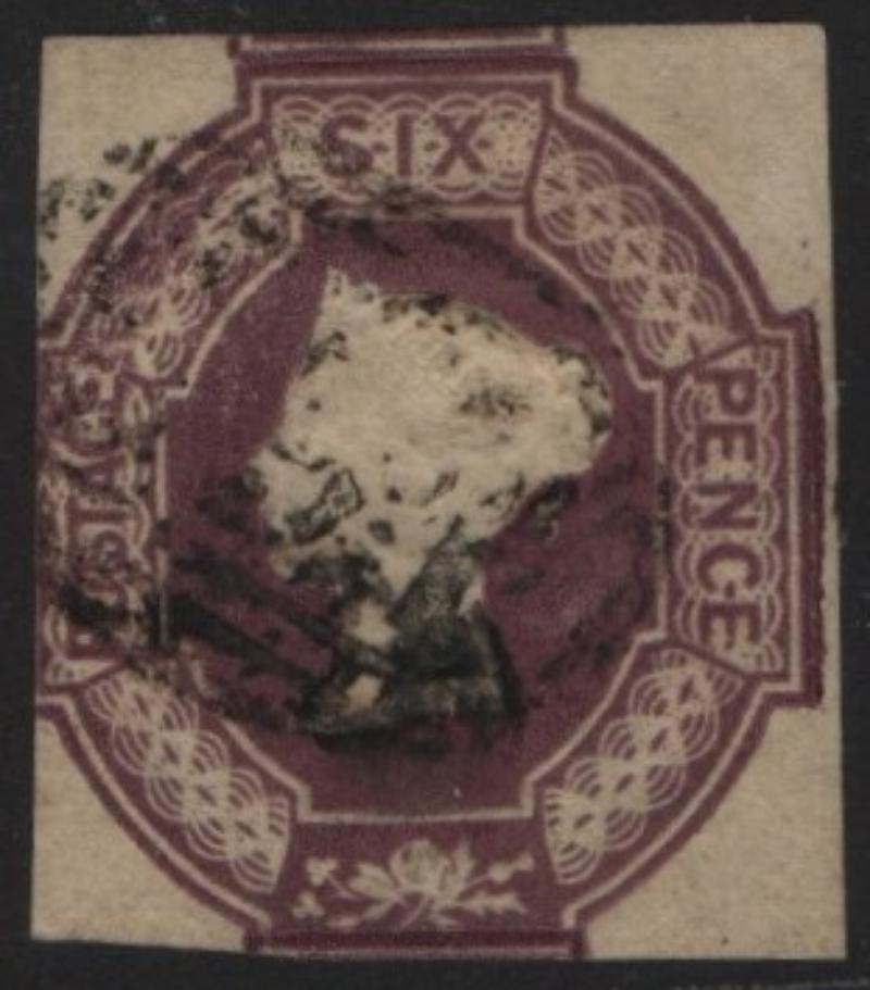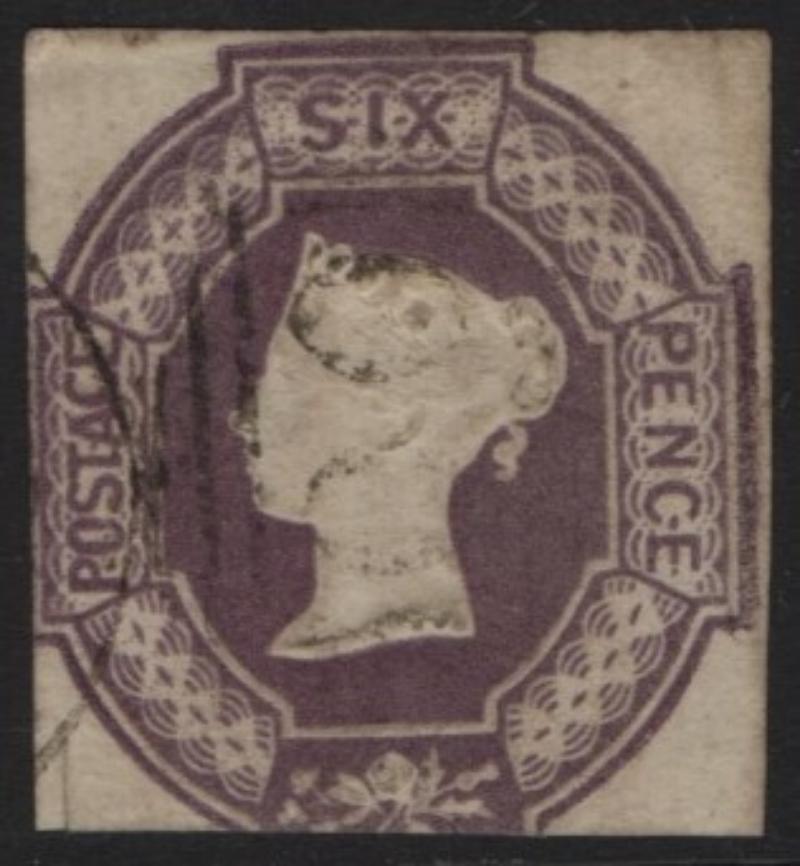 Embossed 6d red violet, black cancel, touching at bottom just in at left, HR, possible mauve shade (Image)