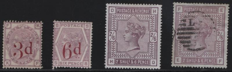 94-96 F (4) Classics: Victoria 3d & 6d surcharges, both unused, regummed, 3d w/ corner crease; 2sh6d unused regummed & used w/ grid cancel, both w/ four margins (premium in Scott), used w/ small scuff UL (Image)