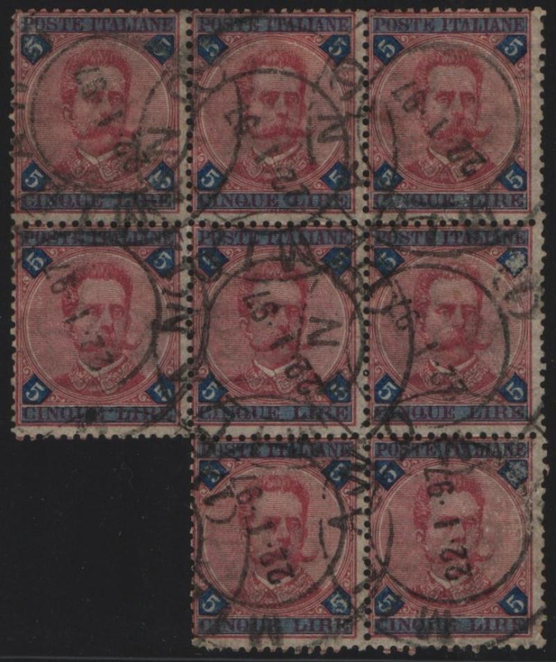 VF+ Humbert I, 5L blue & rose, Block/8, Cert by Silvano Sorani states original cancels (Image)